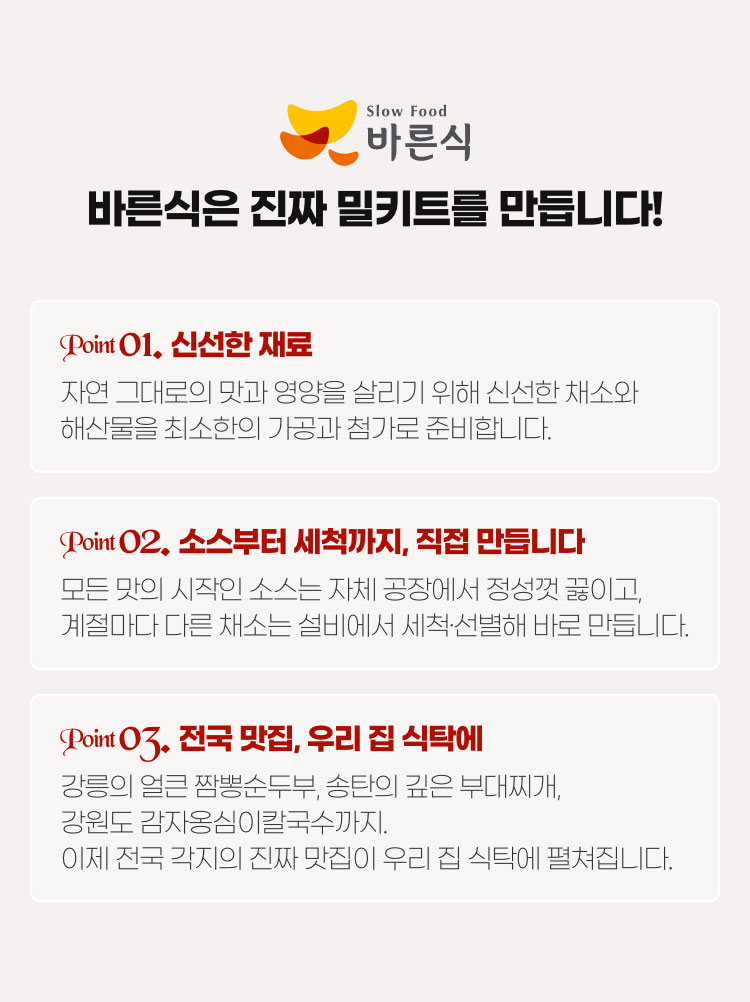 Point 01, 신선한 재료 자연 그대로의 맛과 영양을 살리기 위해 신선한 채소와 해산물을 최소한의 가공과 첨가로 준비합니다. Point 02. 소스부터 세척까지, 직접 만듭니다 모든 맛의 시작인 소스는 자체 공장에서 정성껏 끓이고 계절마다 다른 채소는 설비에서 세척 선별해 바로 만듭니다. Point 03. 전국 맛집, 우리 집 식탁에 강릉의 얼큰 짬뽕순두부, 송탄의 깊은 부대찌개, 강원도 감자옹심이칼국수까지. 이제 전국 각지의 진짜 맛집이 우리 집 식탁에 펼쳐집니다.