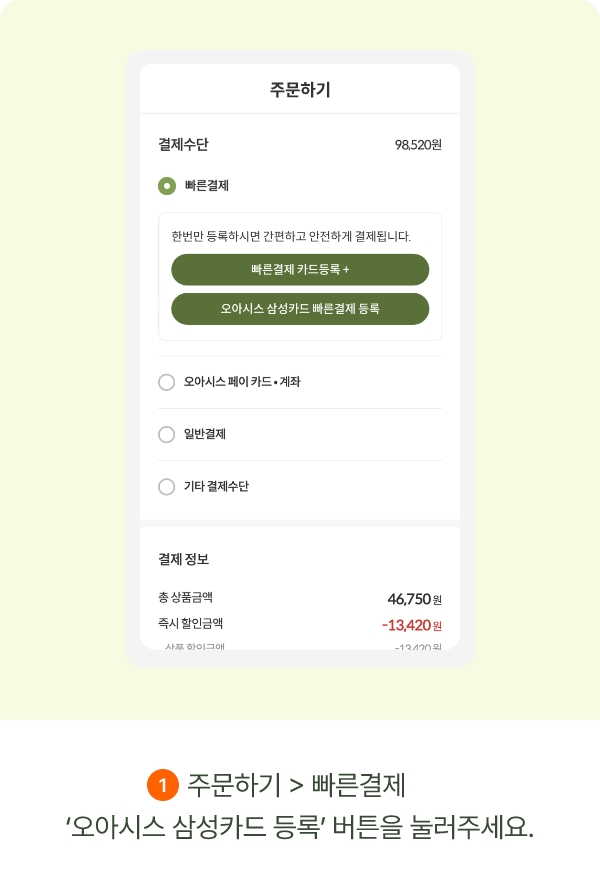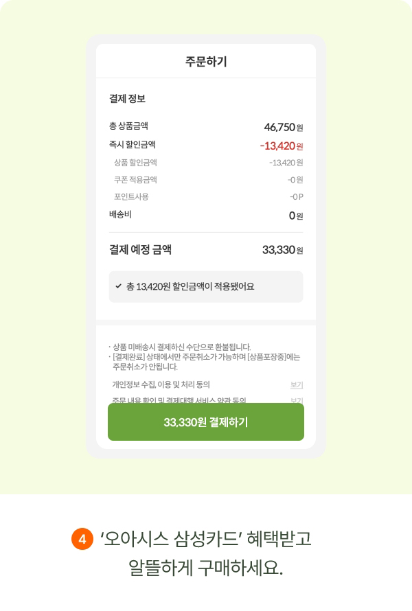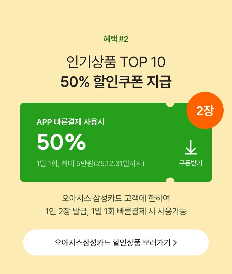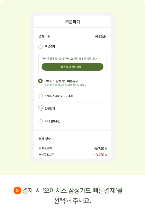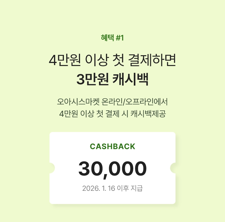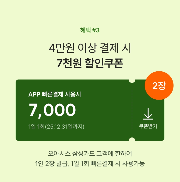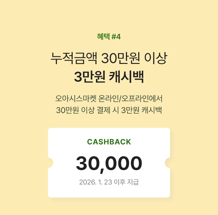 네이버페이, 카카오페이, PAYCO, Paypal, 유비페이 등을 통한 간편결제, 일반결제, 오아시스 페이카드, 기타결제수단은 혜택적용 제외