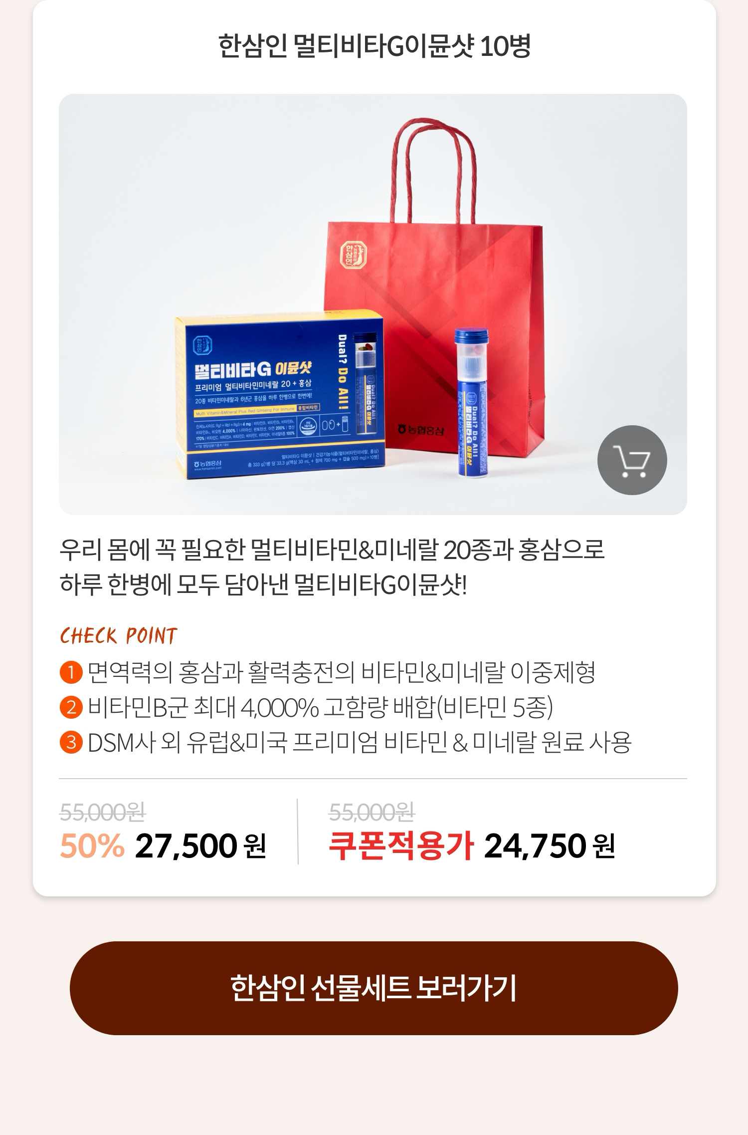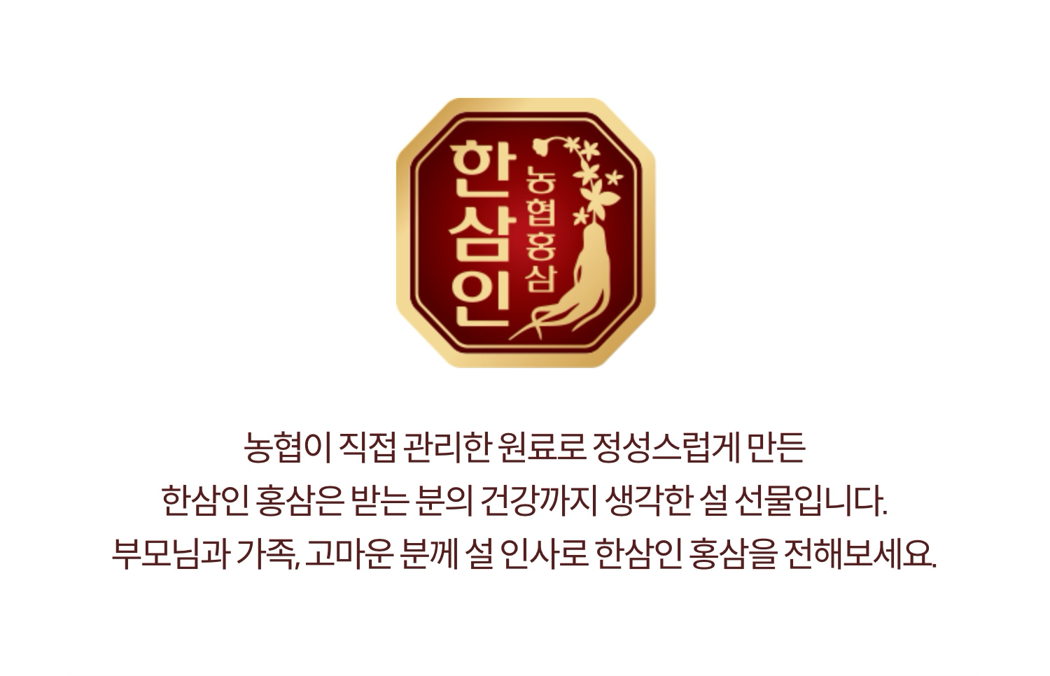 농협이 직접 관리한 원료로 정성스럽게 만든 한삼인 홍삼은 받는 분의 건강까지 생각한 설 선물입니다. 부모님과 가족, 고마운 분께 설 인사로 한삼인 홍삼을 전해보세요.
