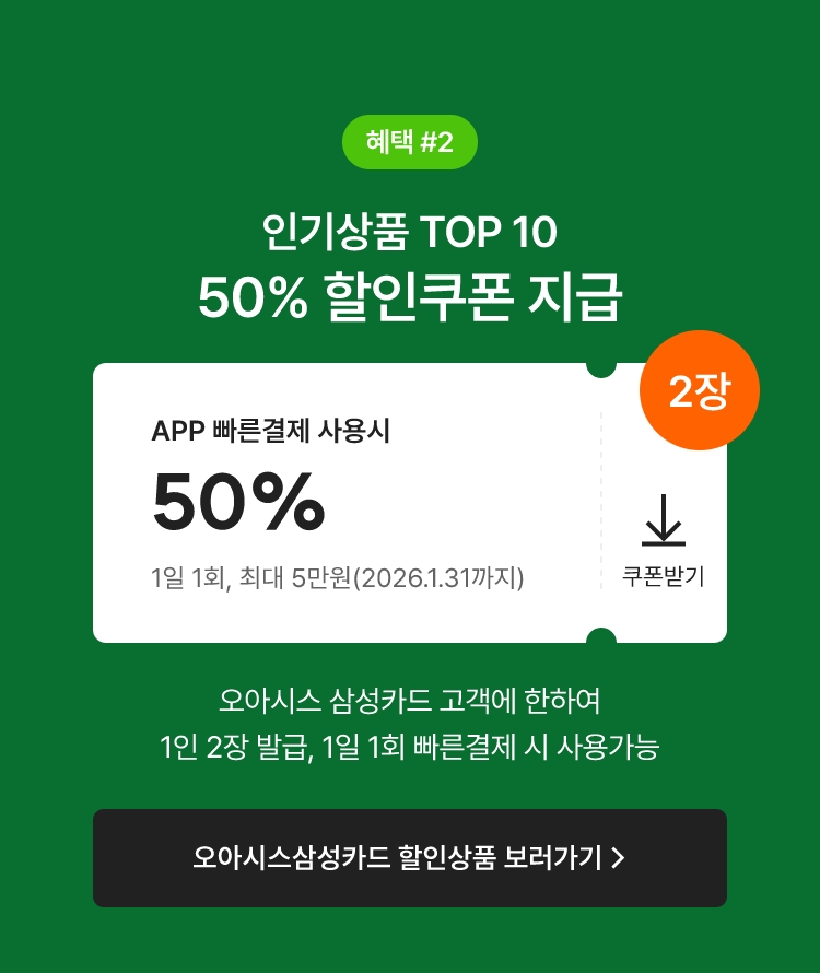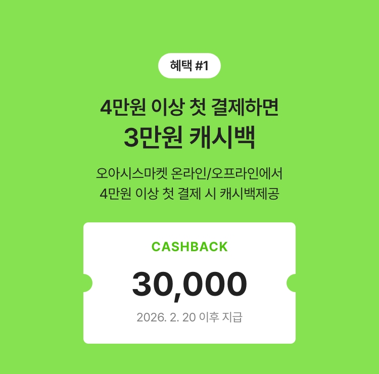 네이버페이, 카카오페이, PAYCO, Paypal, 유비페이 등을 통한 간편결제, 일반결제, 오아시스 페이카드, 기타결제수단은 혜택적용 제외