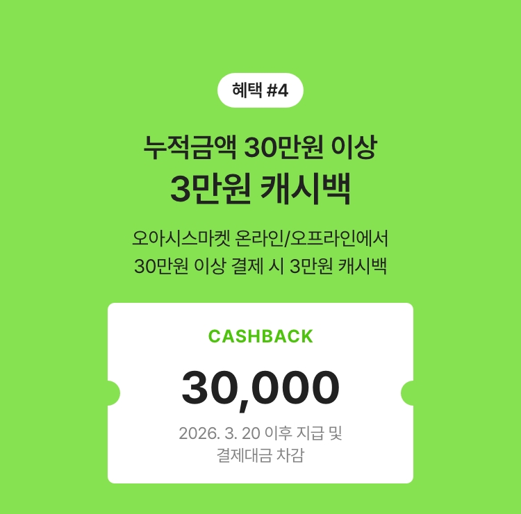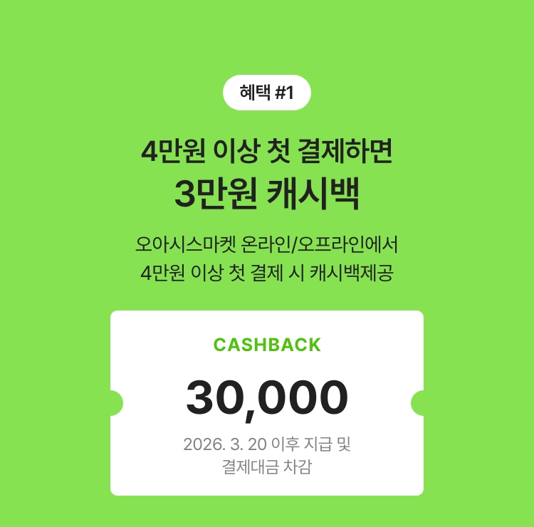 네이버페이, 카카오페이, PAYCO, Paypal, 유비페이 등을 통한 간편결제, 일반결제, 오아시스 페이카드, 기타결제수단은 혜택적용 제외