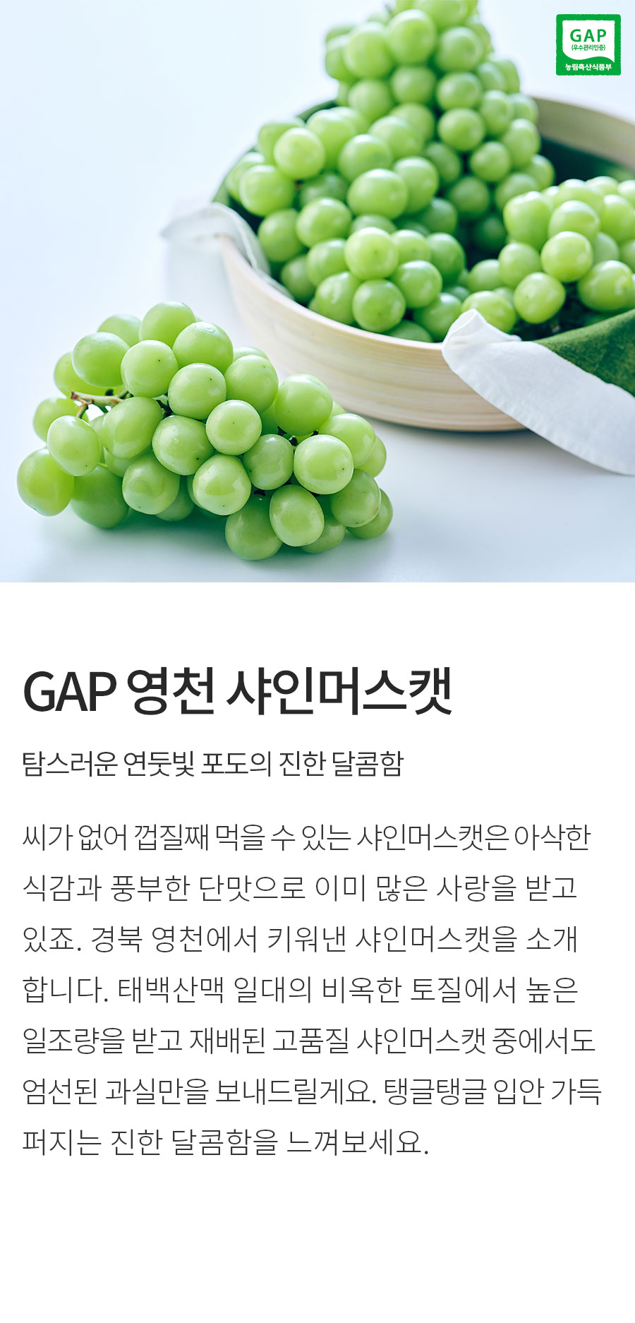 GAP 영천 샤인머스캣(2kg) 수량빼기 수량추가 19,000 원 총 수량 1 개 19,000 원 구매옵션 닫기 찜하기 추가 찜하기 삭제 구매후기 8 상품상세 정기구독 장바구니 정기구독 장바구니 품절 정기배송 장바구니