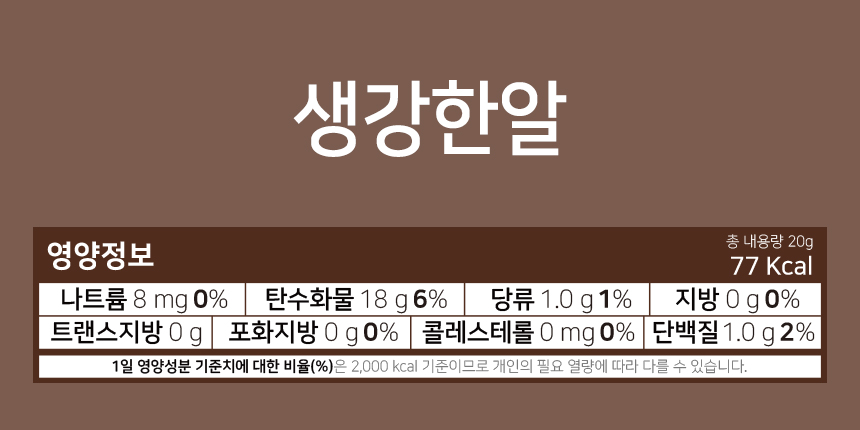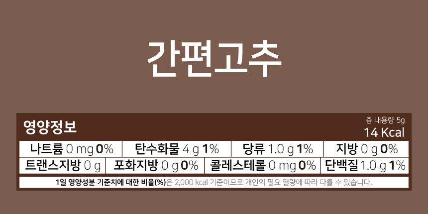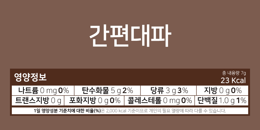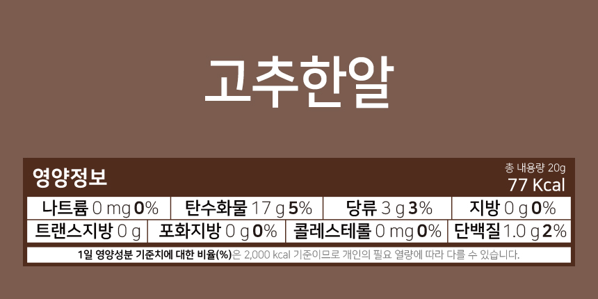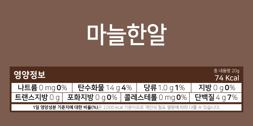 마늘한알: 마늘 100% / 고추한알: 청양고추 81%, 덱스트린 / 생강한알: 생강 81%, 덱스트린 / 간편고추: 청양고추 100% / 간편대파: 대파 100%