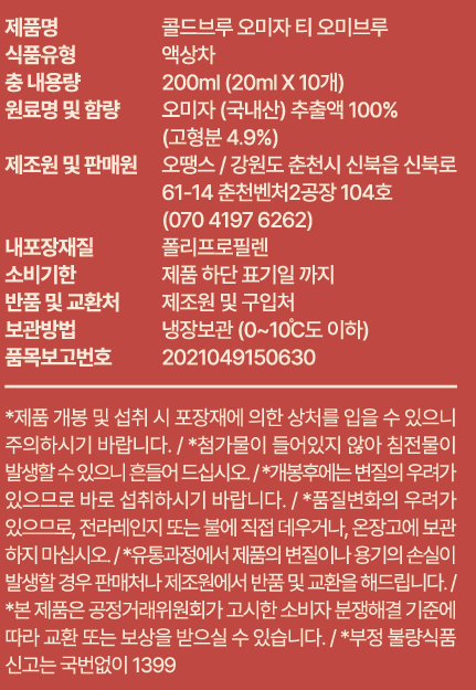 • [정기배송] 오땡스 콜드브루 오미자차 오미브루 200ml (20mlx10입)