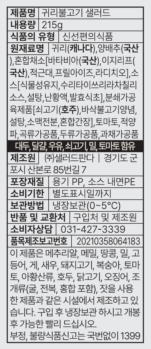 [세끼판다] 귀리불고기 샐러드(215g) 수량빼기 수량추가 6,500 원 1개 남음 총 수량 1 개 6,500 원 구매옵션 닫기 찜하기 추가 찜하기 삭제 구매후기 210 상품상세 정기구독 장바구니 정기구독 장바구니 구매하기 정기배송 장바구니