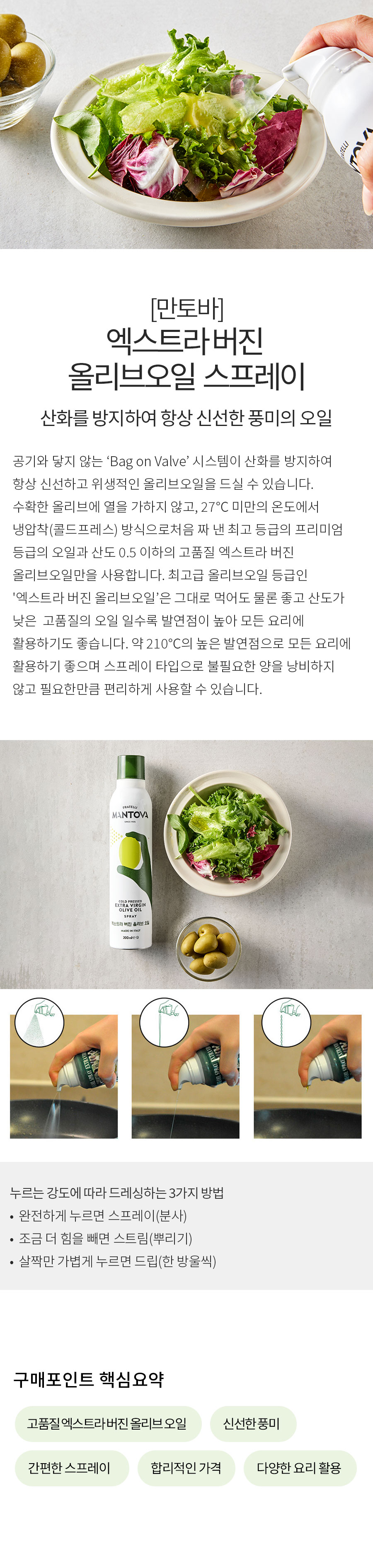 만토바 엑스트라 버진 올리브오일 스프레이 (200ml) 수량빼기 수량추가 14,350 원 총 수량 1 개 14,350 원 구매옵션 닫기 찜하기 추가 찜하기 삭제 구매후기 146 상품상세 정기구독 장바구니 정기구독 장바구니 구매하기 정기배송 장바구니