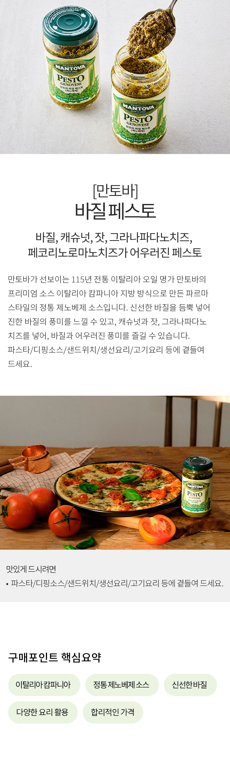 - 바질, 해바라기씨유, 그라나파다노치즈(우유, 정제소금, 계란라이소짐), 캐슈넛, 감자, 엑스트라버진올리브오일, 천일염, 페코리노로마노치즈(양유, 우유응고효소, 천일염, 발효우유), 설탕, 잣, 마늘, 글루코노-락톤 / 우유, 계란, 잣 함유