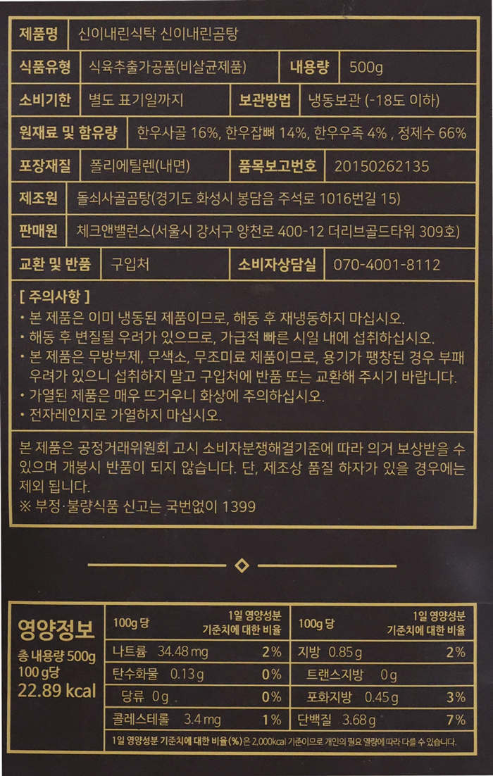 • 본 제품은 이미 냉동된 제품이므로, 해동 후 재냉동하지 마십시오. • 해동 후 변질될 우려가 있으므로, 가급적 빠른 시일 내에 섭취하십시오. • 본 제품은 무방부제, 무색소, 무조미료 제품이므로, 용기가 팽창된 경우 부패 우려가 있으니 섭취하지 말고 구입처에 반품 또는 교환해 주시기 바랍니다. • 가열된 제품은 매우 뜨거우니 화상에 주의하십시오. • 전자레인지로 가열하지 마십시오.