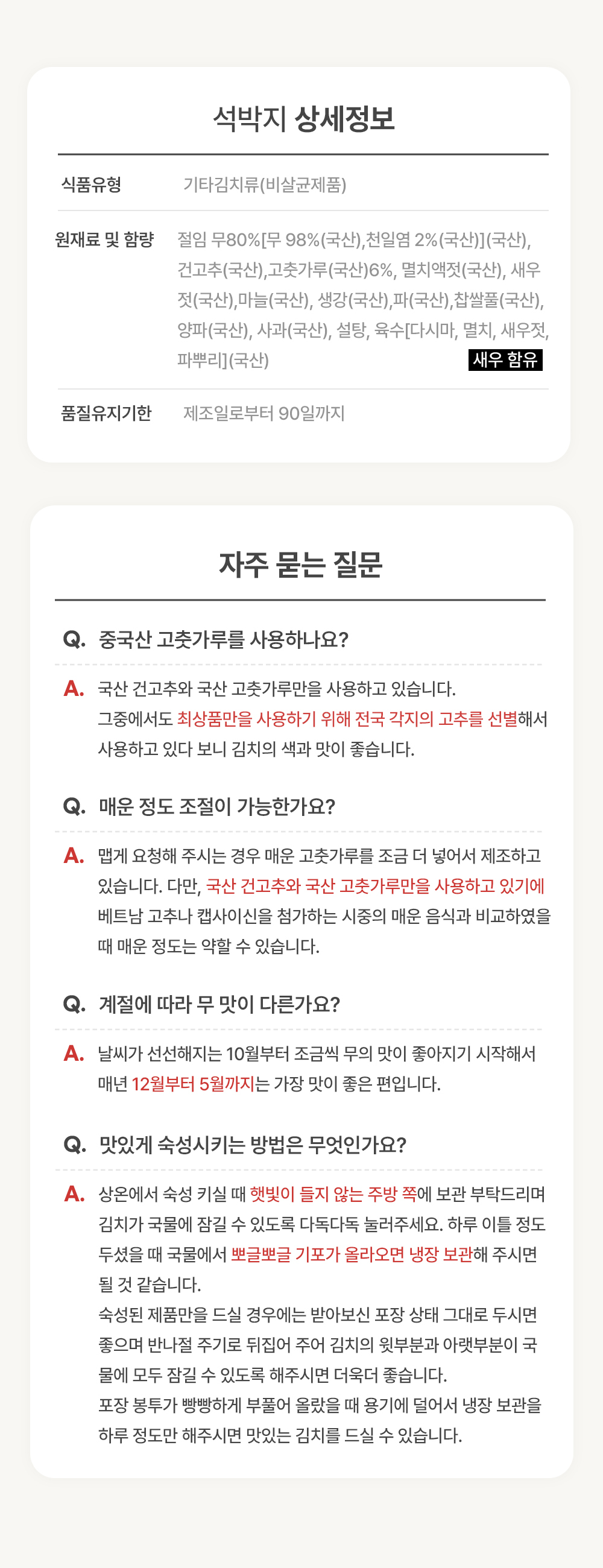절임무80%[무98%,천일염(국산)2%](국산),건고추(국산)6%,고춧가루(국산),멸치액젓(국산),새우젓(국산),마늘(국산),파(국산),찹쌀풀(국산),양파(국산),사과(국산),설탕,육수[다시마,멸치,새우젓,파뿌리](국산)