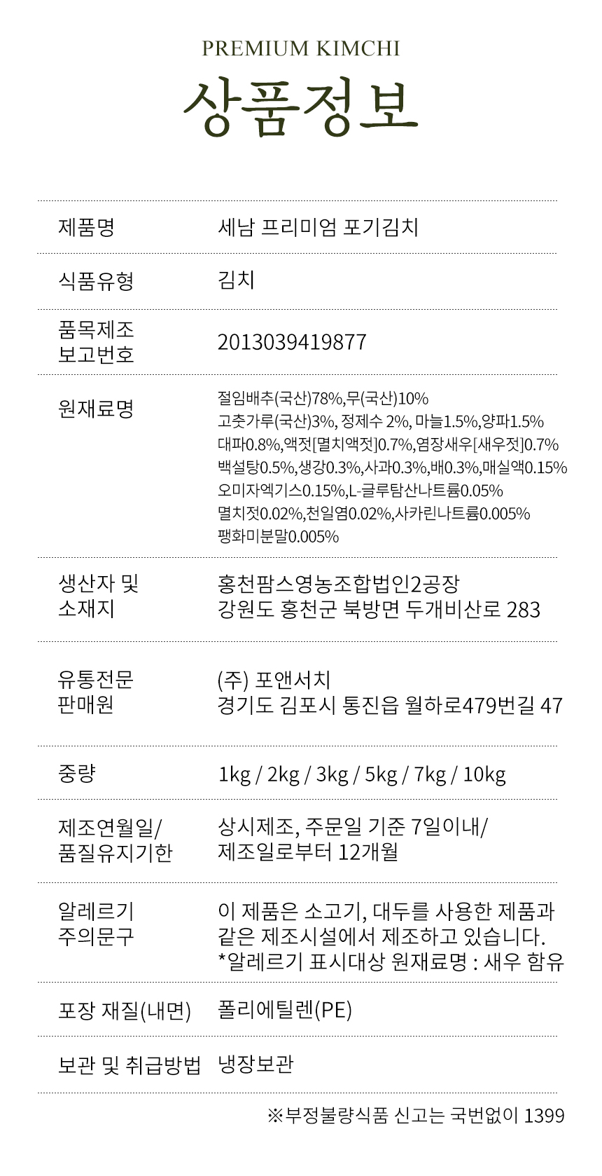 프리미엄 김치 (올국산100%) 포기김치 3kg