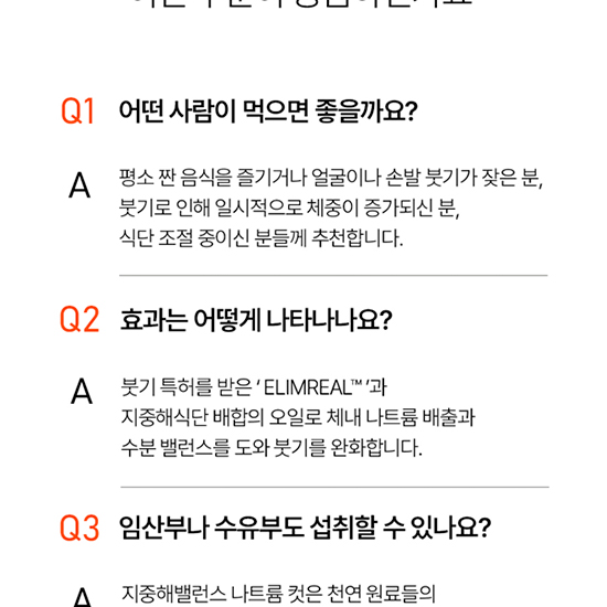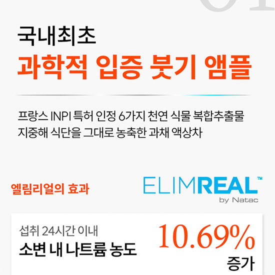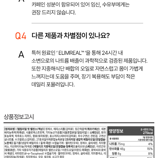 - [원재료명][엘림리얼 핏 밸런스(혼합음료)] 정제수, 에리스리톨(감리료), 당근착즙액(튀르키예산), 세븐베리농축액(세븐베리농축액 : 미국산), 시클로덱스트린액, 기타농산가공품[식물혼합분말(엘림리얼)/스페인산], 토마토농축액, 락스로스 리퀴드, 향료(토마토향), 효소처리스테비아(감미료), 무수구연산, 잔탄검, 구연산삼나트륨, 수크랄로스(감미료), 27종과일야채혼합농축분말 [프리미엄 냉압착 페릴라오일(기타식물성유지)] 들기름(냉압착 페릴라유 / 들깨:국산) ※캡슐기제 : 젤라틴(우피), 정제수, 글리세린, 치자황색소, 이산화티타늄(착색료) [에필리프 지중해오일(기타 식용유지가공품)] 올리브유(스페인산), 아르간유(모로코산), 기타 식용유지가공품[에필리프 밸런스오일 / 아몬드오일(아몬드: 미국산), 호박씨유(호박씨:국산)], 비타민E(dl-a-Tocopherol) ※캡슐기제 : 젤라틴(우피), 정제수, 글리세린, 치자황색소, 이산화티타늄(착색료), 치자청색소