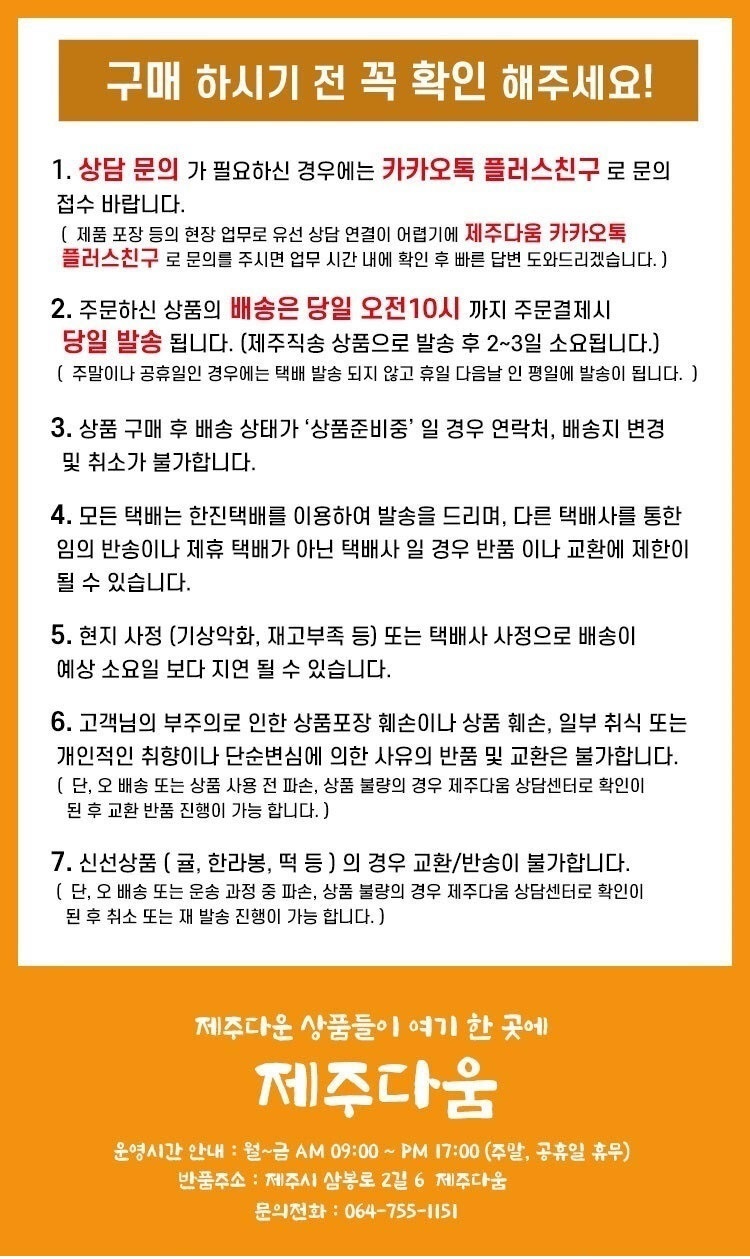 상품별 제조연월일이 상이하여 정확한 소비기한을 확인하시려면 010-7251-1151 제주다움으로 문의주시기 바랍니다.