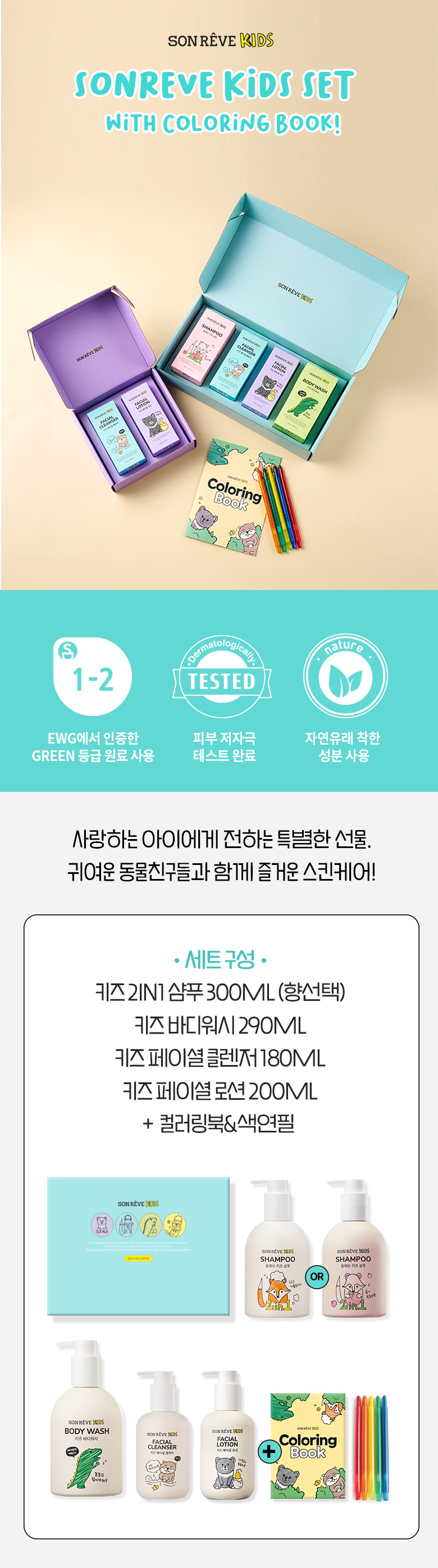 쏭레브 키즈 4종 선물세트 (샴푸+바디워시+페이셜로션+페이셜클렌저+컬러링북)(옵션선택)