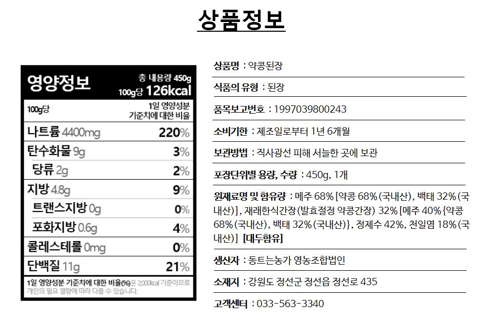 68%(국내산), 백태 32%(국내산)}, 정제수 42%, 천일염 18%(국
