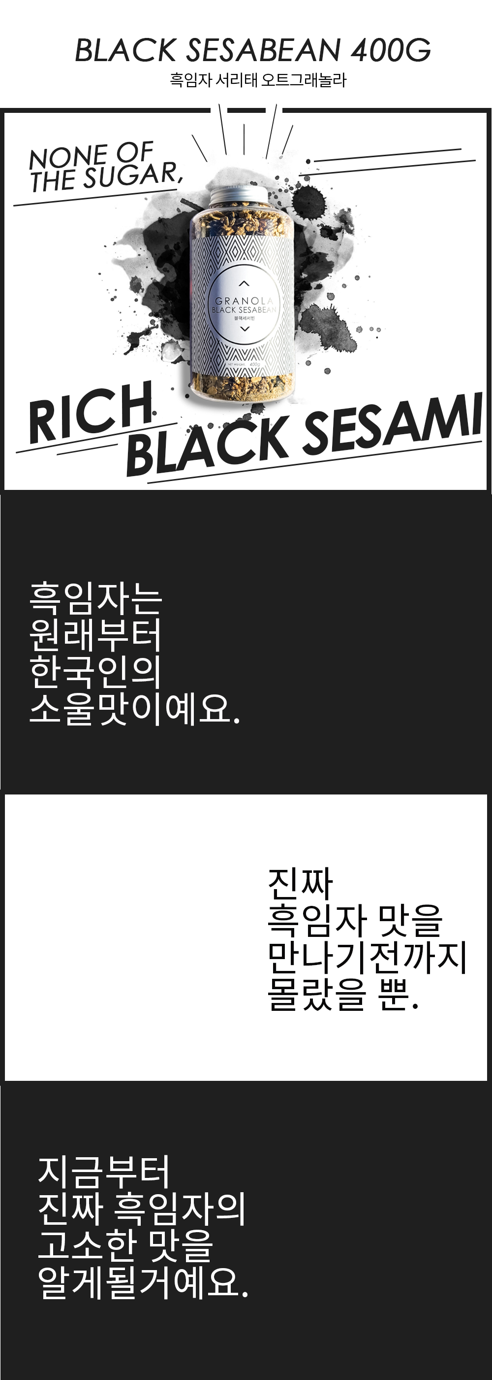 진하게 고소한 흑임자와 바삭담백한 로스팅 서리태, 부드러운 오트밀의 완벽한 조화. 설탕이 없어 더 맛있고 천연재료만으로 건강하게 만들었어요