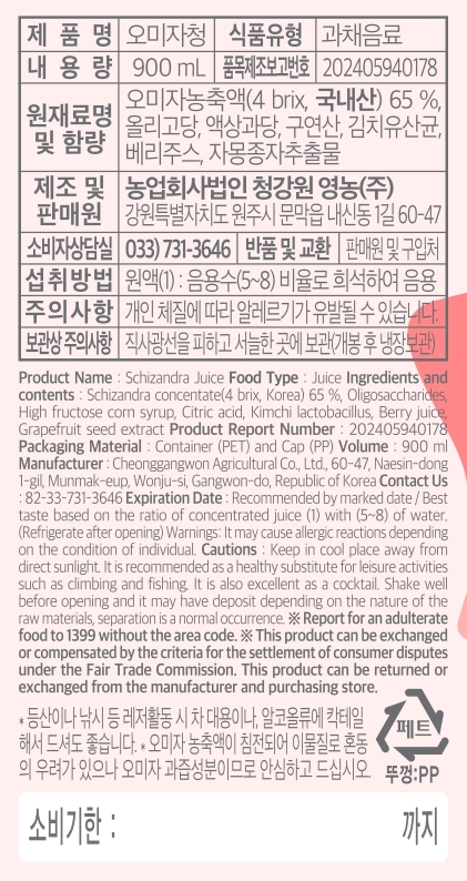 - 오미자농축액(국내산)65%, 프락토올리고당, 액상과당, 구연산, 플란타김치유산균, 베리주스, 자몽종자추출물
