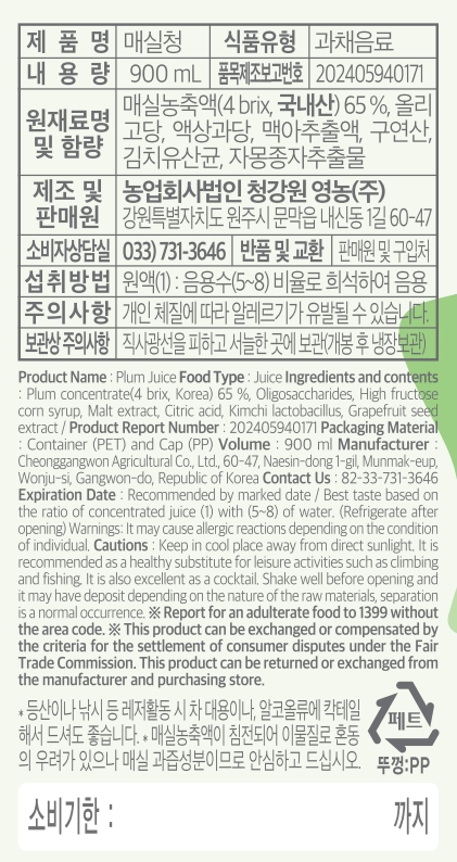 - 매실농축액(국내산)65%, 프락토올리고당, 액상과당, 맥아추출액, 구연산, 플란타김치유산균, 자몽종자추출물