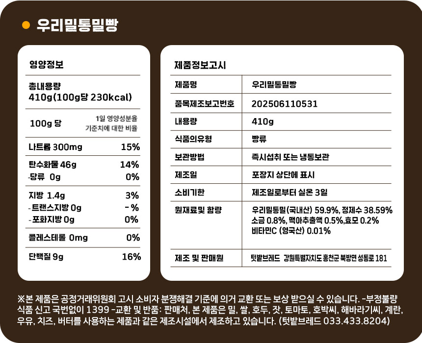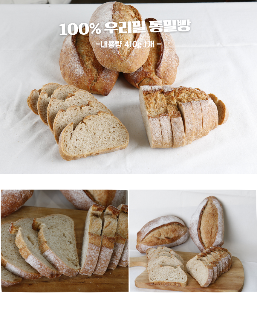 100% 통밀빵 우리밀 무설탕 천연발효종 건강 통곡물 식빵 410g