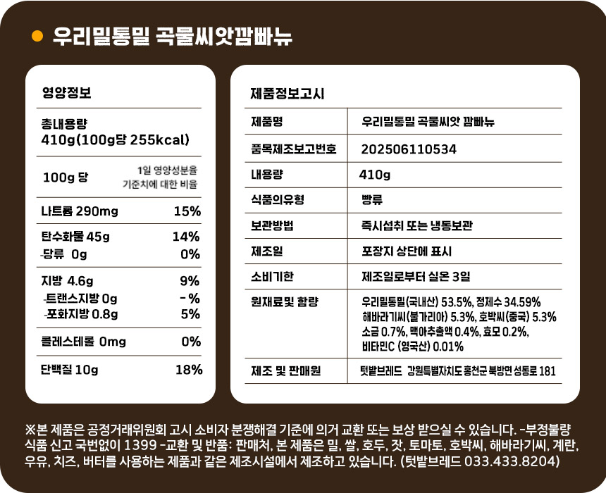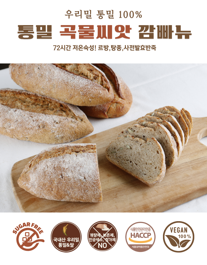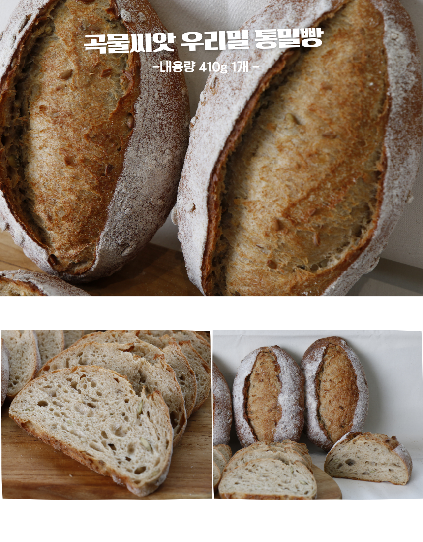 • 통밀 곡물씨앗 깜빠뉴 100% 우리밀 천연발효 비건 통곡물 빵 410g