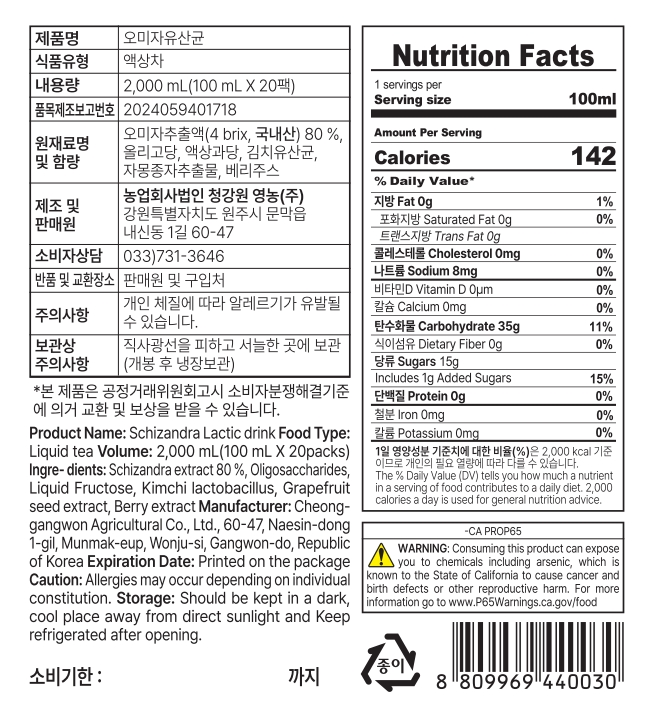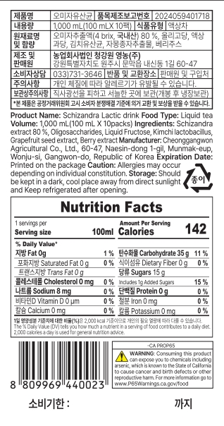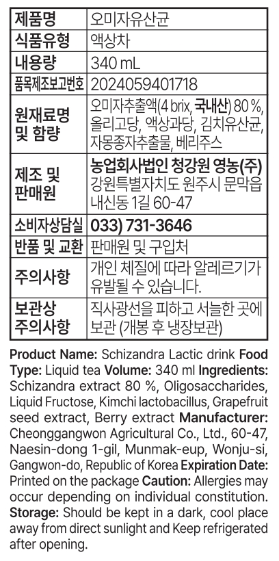 - 오미자추출액(국내산)80%, 프락토올리고당, 액상과당, 플란타김치유산균, 베리주스, 자몽종자추출물