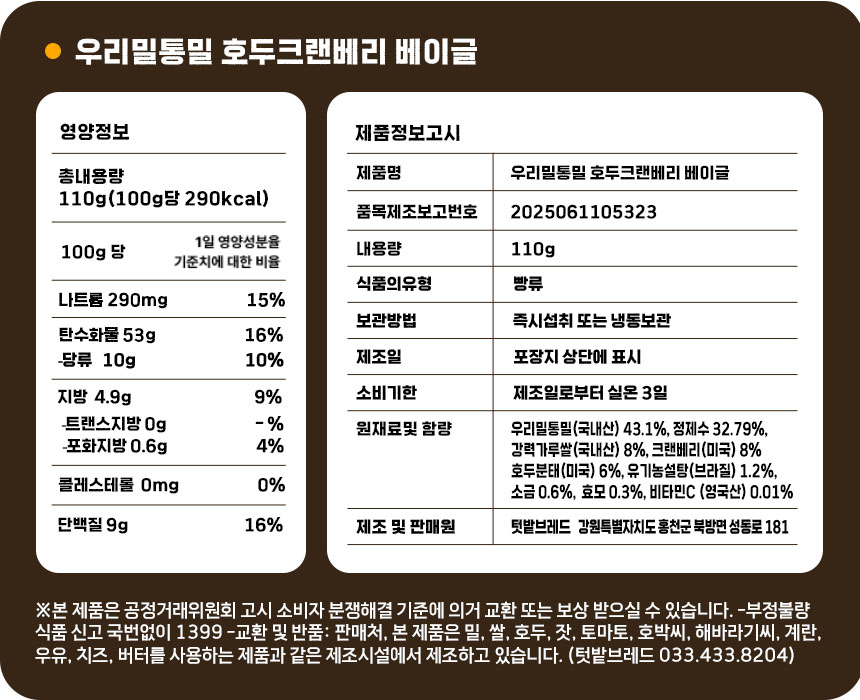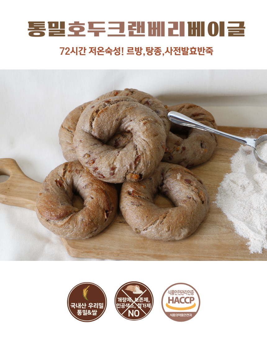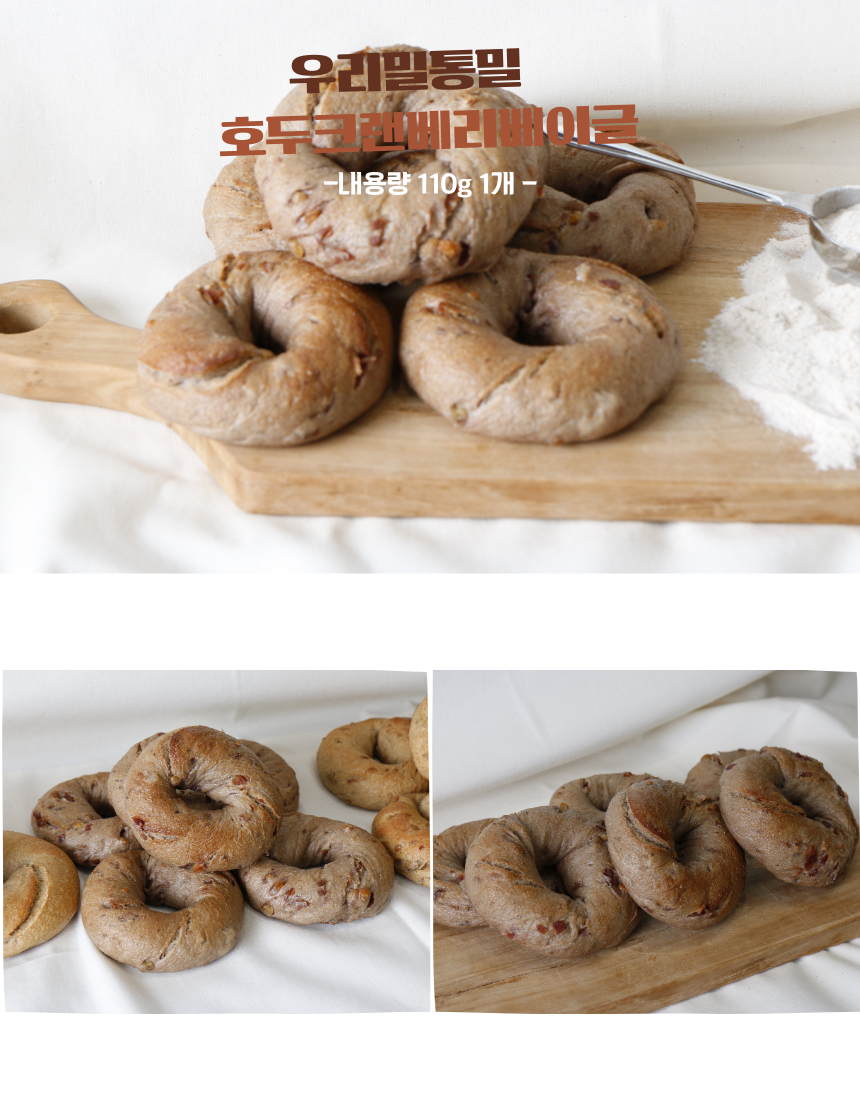 통밀 호두 크랜베리 베이글 110g 우리밀 천연발효 통곡물 건강 빵