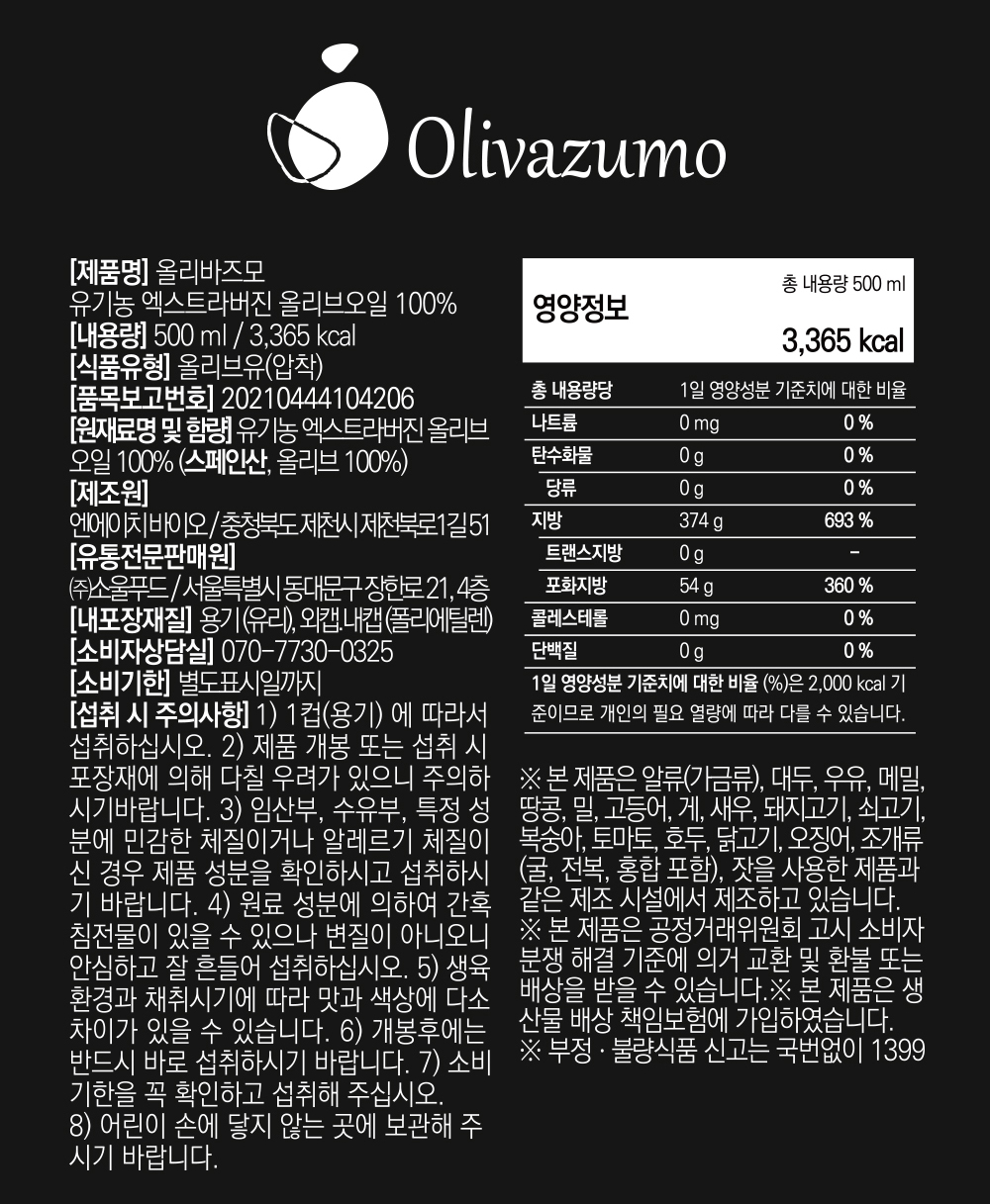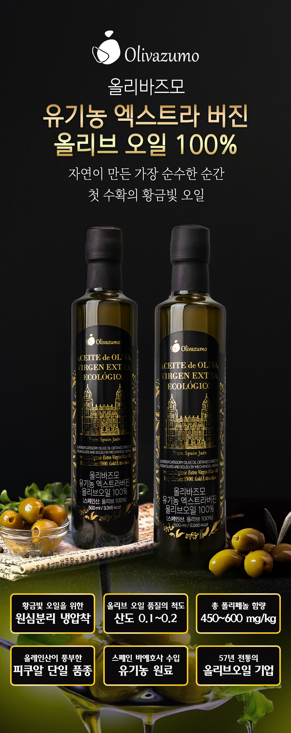 올리바즈모 유기농 엑스트라버진 올리브오일 100% 500ml