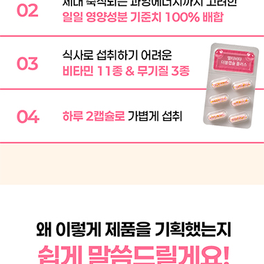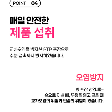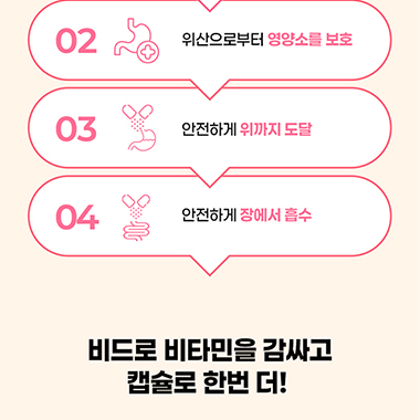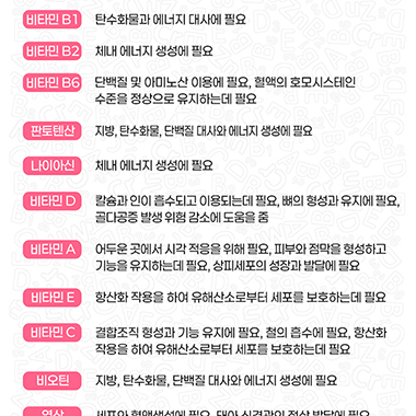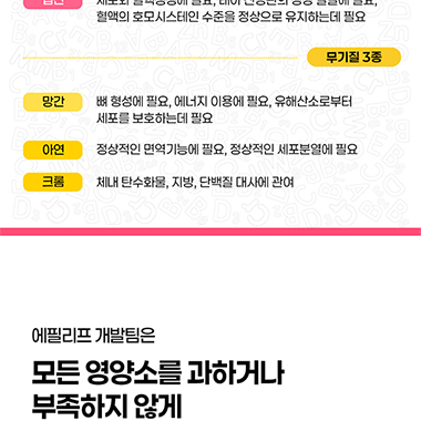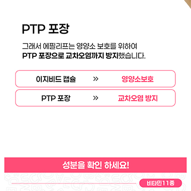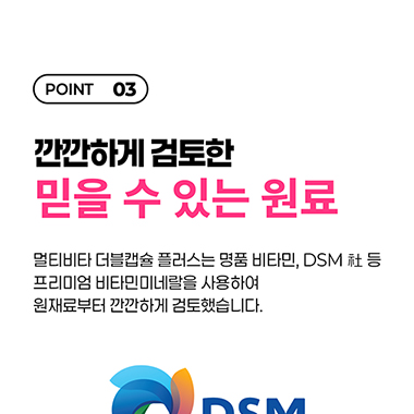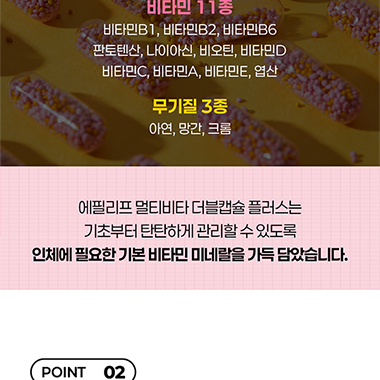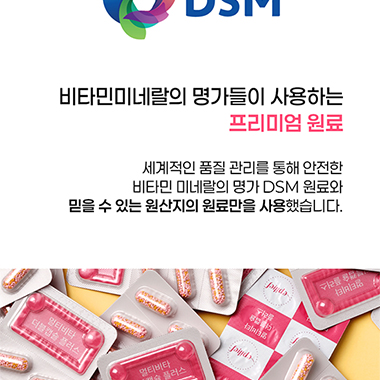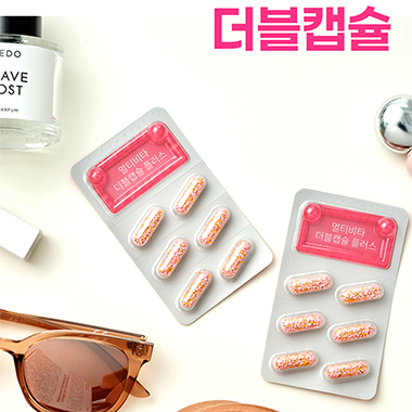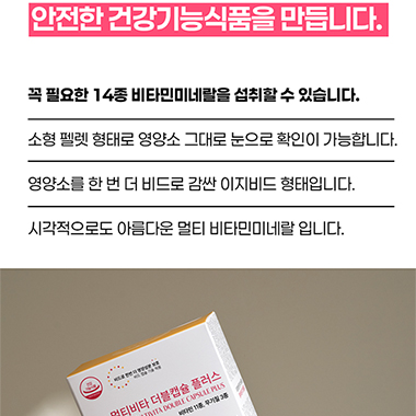 비타민C, 비타민E혼합제제(dl-α-토코페릴아세테이트, 옥테닐호박산나트륨전분, 포도당시럽분말, 이산화규소), 니코틴산아미드, 건조효모(크롬), 산화아연, 황산망간, 비타민A혼합제제{유성비타민A지방산에스테르, 포도당시럽분말, 아라비아검, 옥수수전분, 비타민E(dl-α-토코페롤)}, 판토텐산칼슘, 비타민D3 혼합제제{비타민D3, 자당, 아라비아검, 옥수수전분, 중쇄중성지방유, 이산화규소, 비타민E (dl-α-토코페롤)}, 판토텐산칼슘, 비타민D3혼합제제{비타민D3, 자당, 아라비아검,옥수수전분, 중쇄중성지방유, 이산화규소, 비타민E(dl-α-토코페롤)}, 비오틴혼합제제(비오틴, 제이인산칼슘), 비타민B6염산염, 비타민B1질산염, 비타민B2, 엽산, 결정셀룰로스, 치자황색소, 카민혼합제제[카민제제{덱스트린, 카민(착색료)}, 덱스트린, 치자적색소] / 캡슐기제 : 젤라틴, 정제수, 소르비탄지방산에스테르, 글리세린 돼지고기, 쇠고기 함유