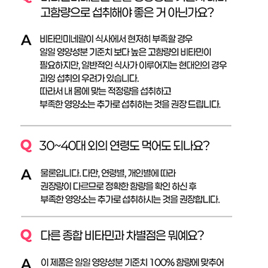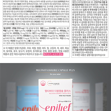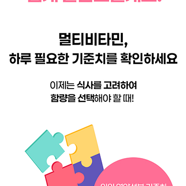 1일 섭취량 당 함량 : 열량 0Kcal, 탄수화물 1g미만(0%), 단백질 0(0%), 나트륨 0mg(0%), 비타민B1 1.2mg(100%), 비타민B2 1.4mg(100%), 비타민B6 1.5mg(100%), 망간 3mg (100%), 나이아신 15mgNE(100%), 엽산 400㎍DFE(100%), 판토텐산 5mg (100%), 비타민D 10㎍(100%), 비타민A 700㎍RAE(100%), 비타민E 11mg a-TE(100%), 비타민C 100mg(100%), 아연 8.5mg(100%), 비오틴 30㎍(100%), 크롬 30㎍(100%)
