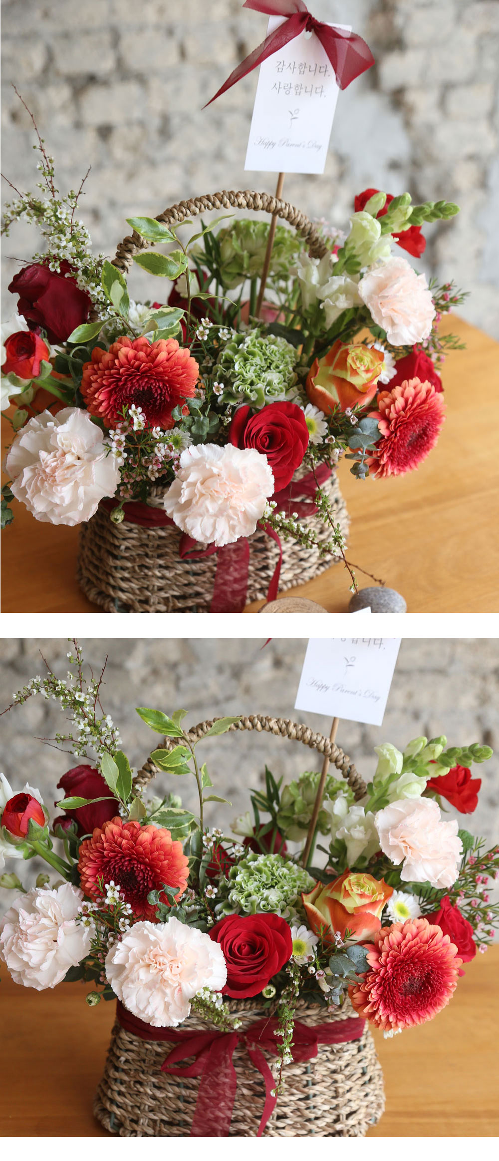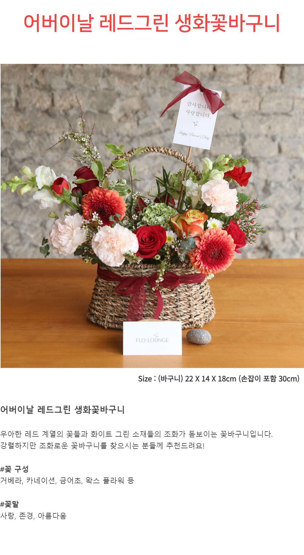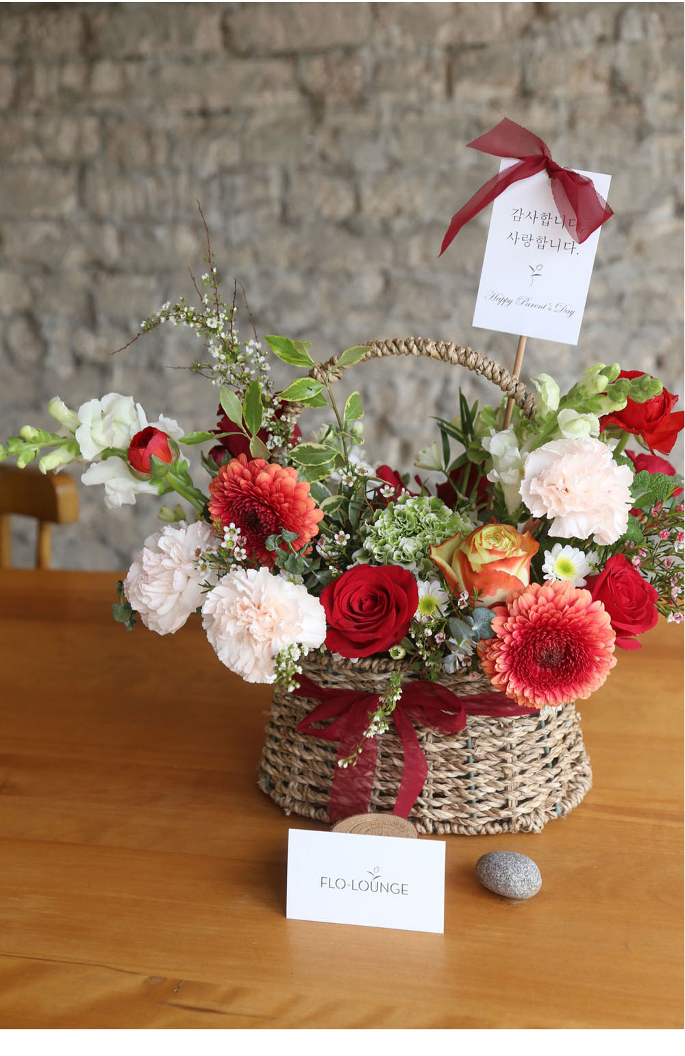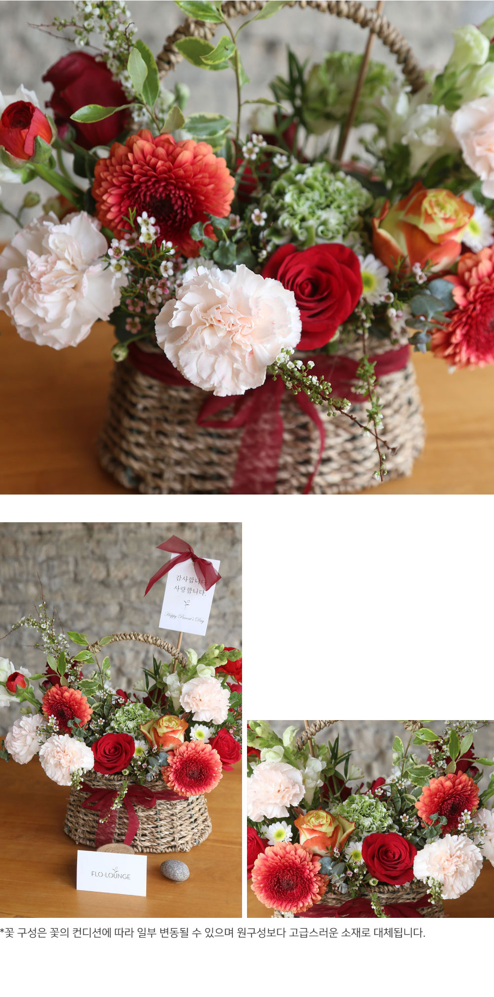 고급스러운 레드계열과 화이트그린의 조화가 좋은 꽃바구니입니다. 강렬하지만 조화로운 꽃색감을 찾으시는 분께 추천드립니다. 플로라운지에서 프리미엄 꽃배송을 즐겨보세요.