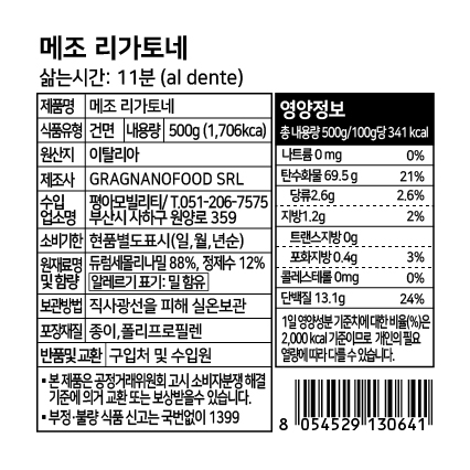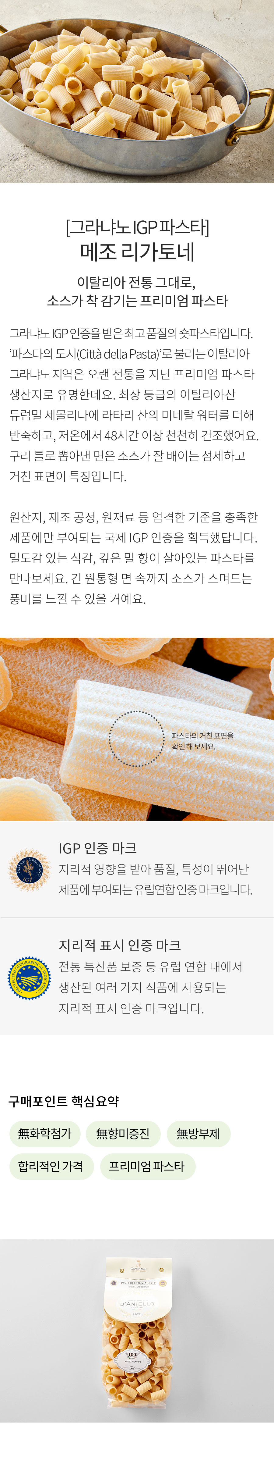 [리뉴얼 특가] 그라냐노 IGP 메조 리가토네 (500g) 수량빼기 수량추가 7,900 원 총 수량 1 개 7,900 원 구매옵션 닫기 찜하기 추가 찜하기 삭제 구매후기 269 상품상세 정기구독 장바구니 정기구독 장바구니 구매하기 정기배송 장바구니