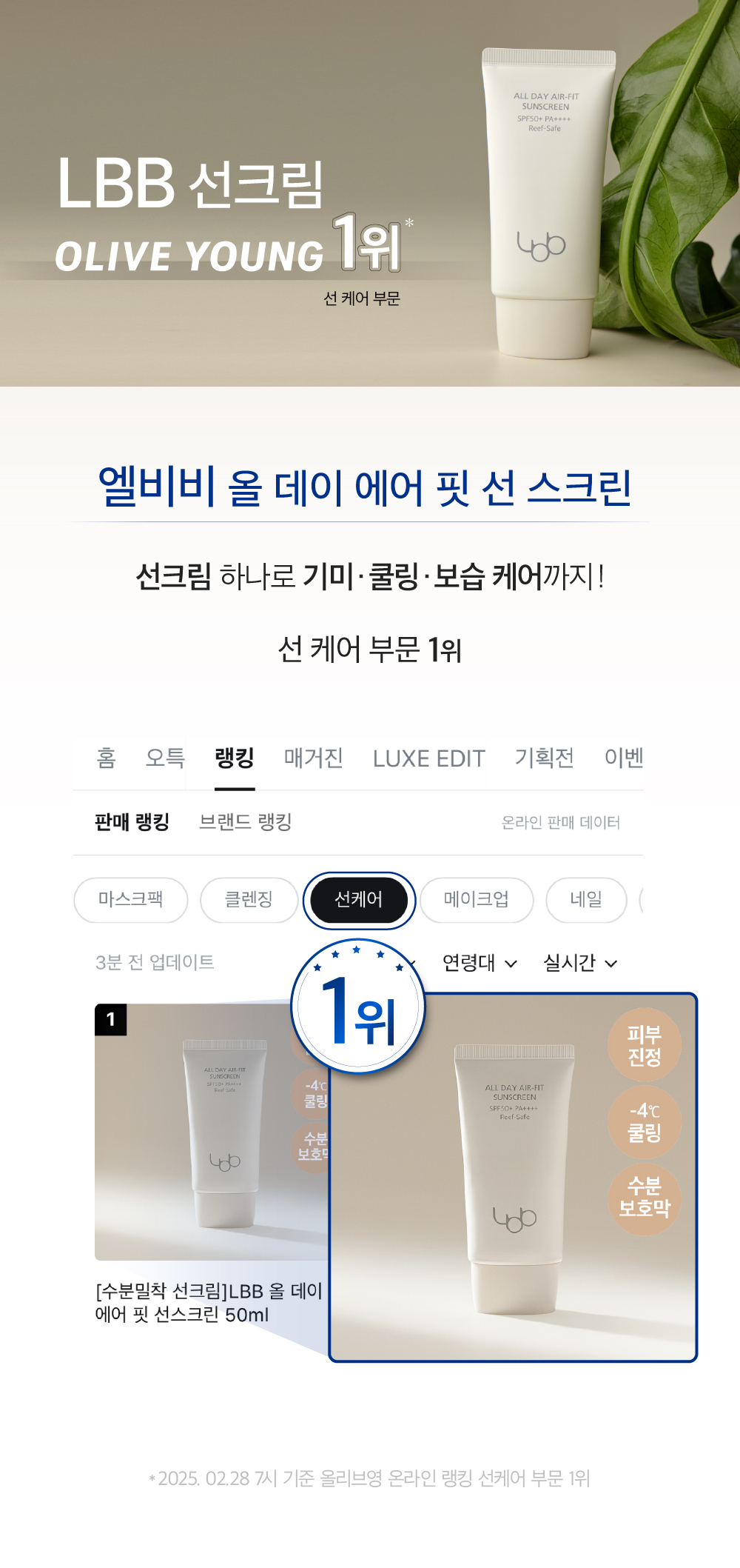 [올리브영 선케어]LBB 엘비비 선스크린 50ml SPF50+ PA++++ 선크림 올 데이 에어 핏 선크림 썬스크린 수분 진정 자외선차단제