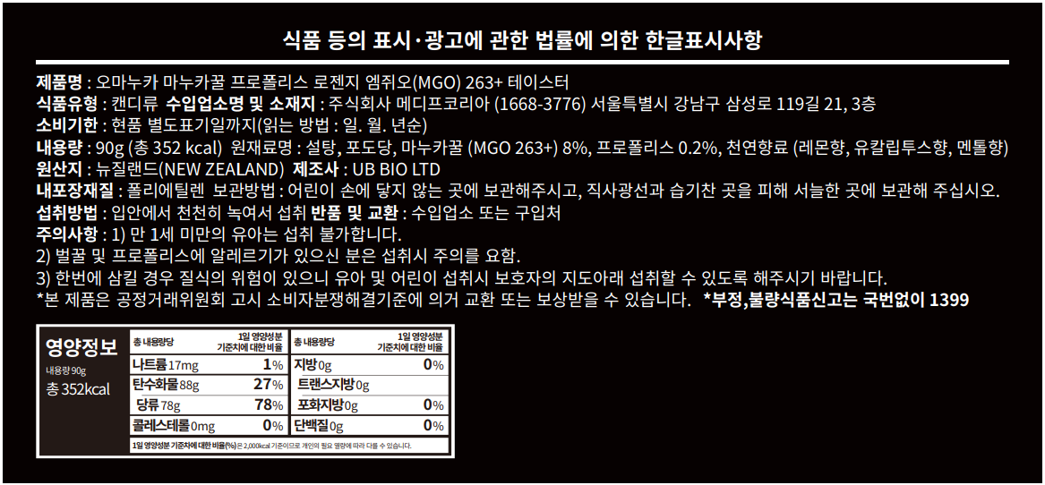 설탕, 포도당, 마누카꿀(MGO 263+) 8%(뉴질랜드산), 프로폴리스 0.2%(뉴질랜드산), 천연향료(레몬향,유칼립투스향,멘톨향)