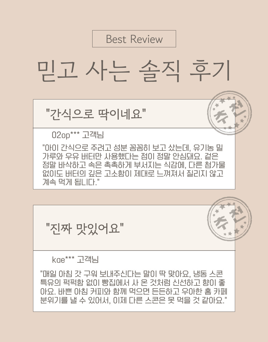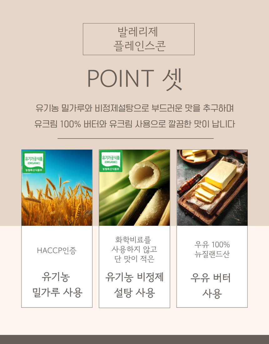 "재료에 타협하지 않습니다. 유기농 밀가루, 동물성 우유 100% 버터, 유기농 비정제 설탕만을 사용해 맛의 깊이와 건강을 동시에 잡았습니다."