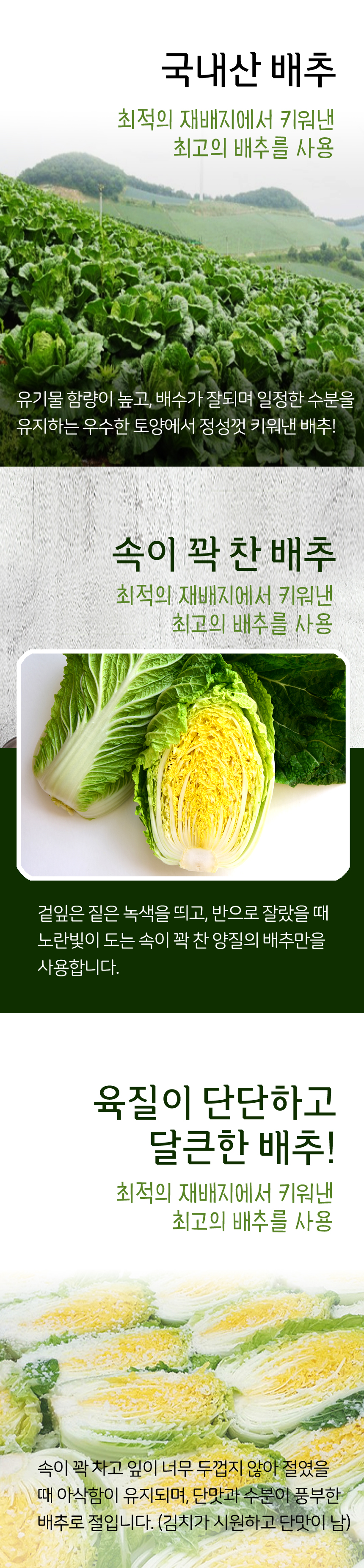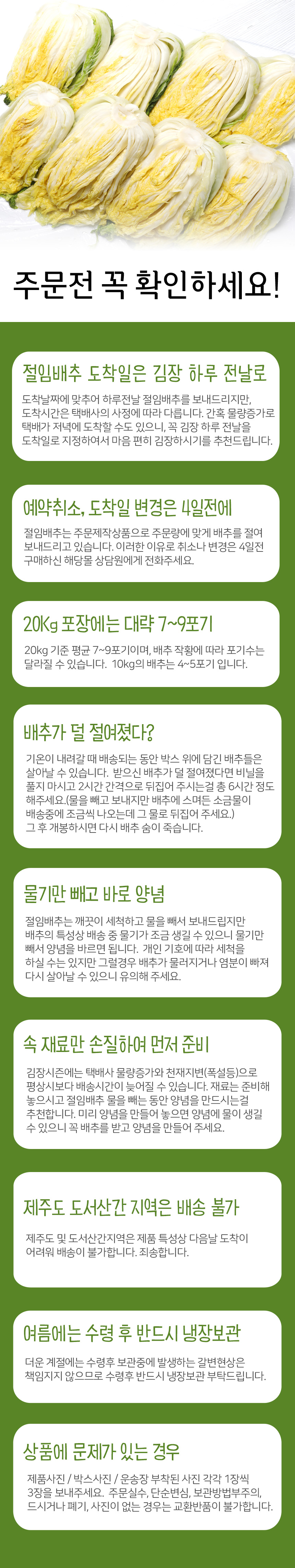 수령 후 상품상태 먼저 확인하시고 바로 사용하지 않으시려면 뒤집어서 보관, 받은 당일 김장 권장. 갈변 현상이 오기때문에 물은 1~2시간 정도만 빼는걸 권장