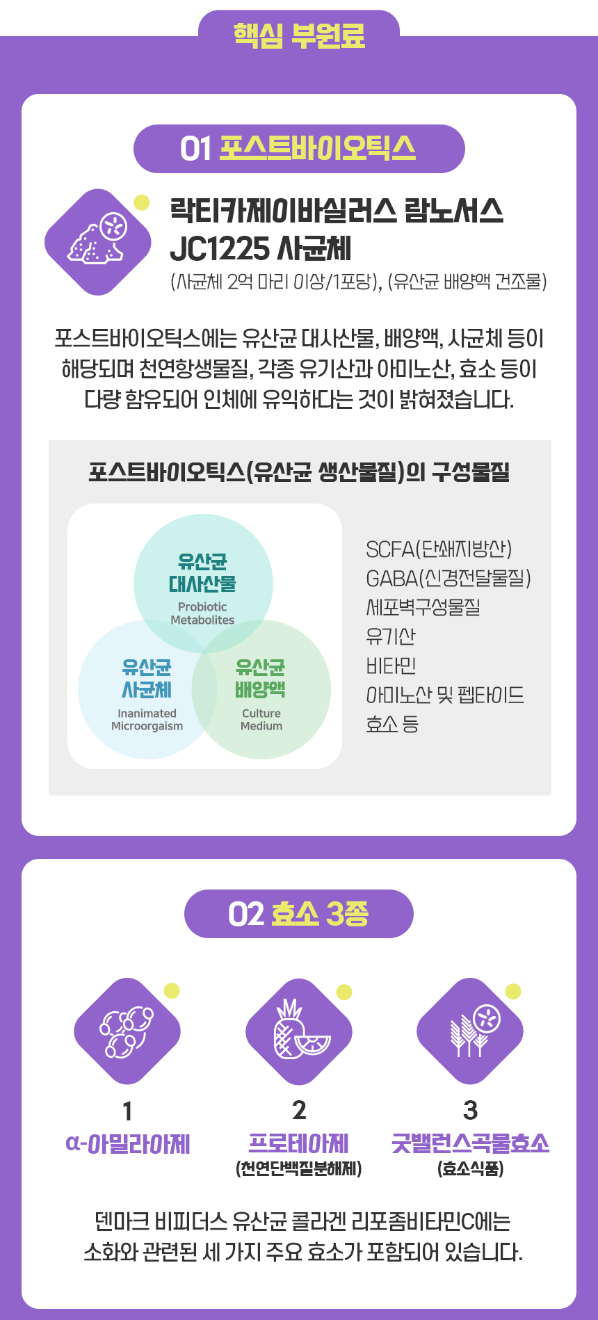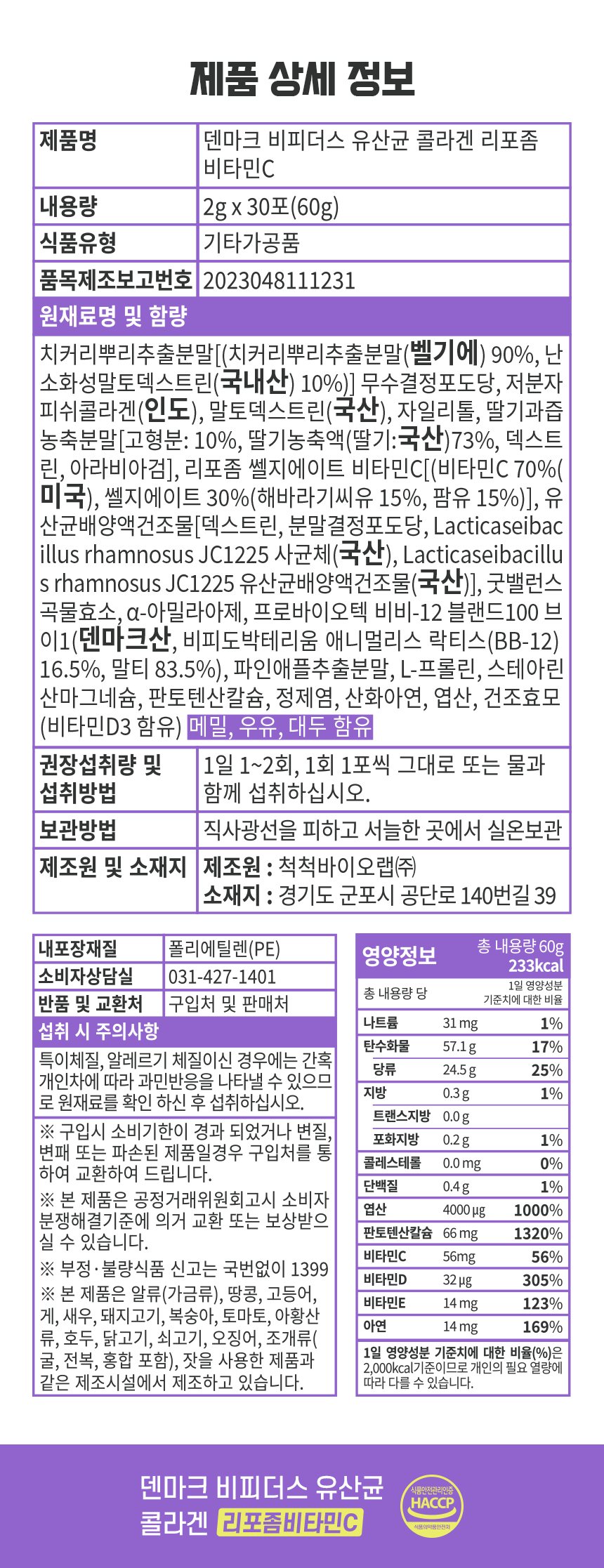 치커리뿌리추출분말[(치커리뿌리추출분말(벨기에) 90%, 난소화성말토덱스트린(국내산) 10%)] 무수결정포도당, 저분자피쉬콜라겐(인도), 말토덱스트린(국산),자일리톨, 딸기과즙농축분말[고형분 : 10%, 딸기농축액(딸기:국산)73%, 덱스트린, 아라비아검], 리포좀 쏄지에이트 비타민C[(비타민C 70%(미국),쏄지에이트 30%(해바라기씨유 15%, 팜유 15%)},유산균배양액건조물[덱스트린,분말결정포도당,Lacticaseibacillus rhamnosus JC1225 사균체(국산), Lacticaseibacillus rhamnosus JC1255 유산균배양액선조물(국산)],굿밸런스곡물효소,a-아밀라아제, 프로바이오텍 비비-12 블랜드 100브리1(덴마크산, 비피도 박테리움 애니멀리스 락티스 (BB-12)16.5%, 말티 83.5%), 파인애플추출분말,L-프롤린,스테아린산마그네슘,판톤텐산칼슘,정제염,산화아연,엽산,건조효모(비타민D3함유) 메밀,우유,대두함유