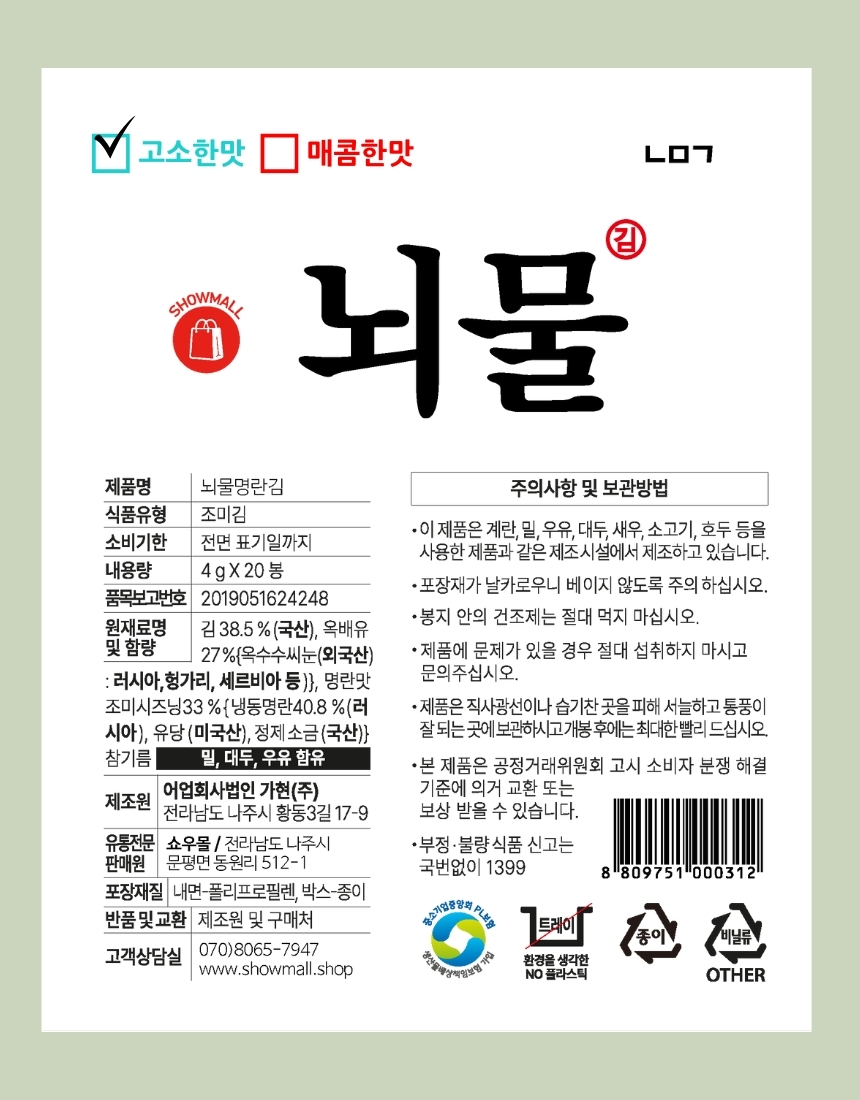 • 뇌물 명란김 6g X 18봉 1박스+사은품