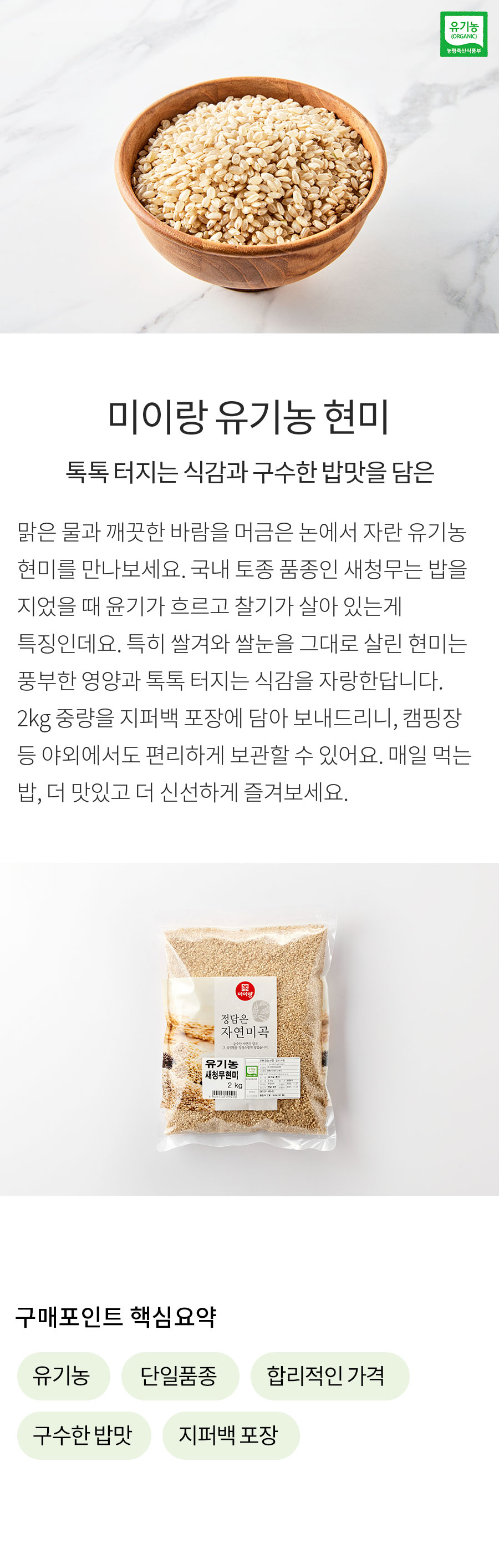 [25년산] 미이랑 유기농 현미 (2kg/새청무) 수량빼기 수량추가 11,500 원 총 수량 1 개 11,500 원 구매옵션 닫기 찜하기 추가 찜하기 삭제 구매후기 2 상품상세 정기구독 장바구니 정기구독 장바구니 구매하기 정기배송 장바구니