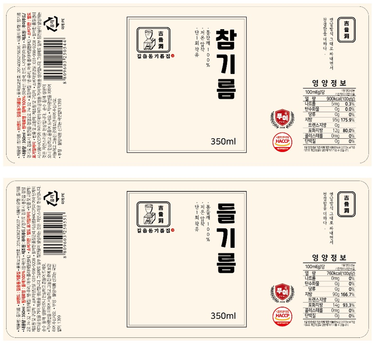 1등급 깨로 갓 착유한 참기름, 들기름 350ml 1+1