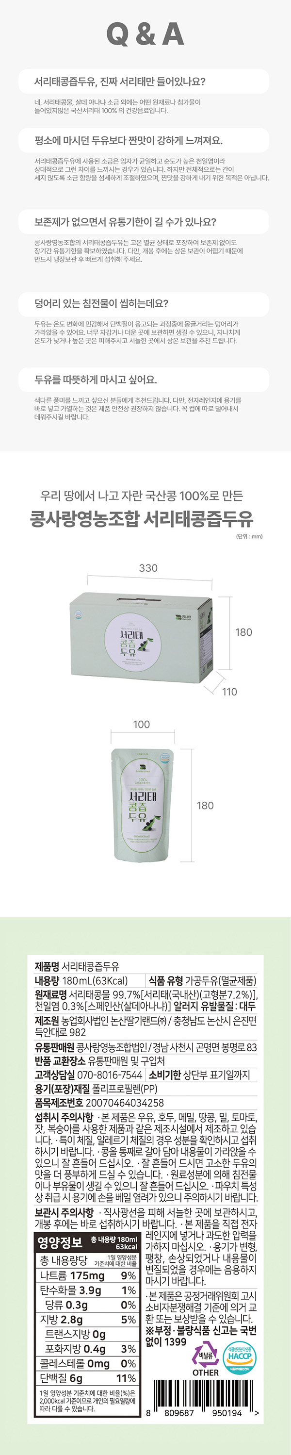 • 콩사랑영농조합 서리태콩즙두유 국산 검은콩 고단백 맷돌 무가당 두유
