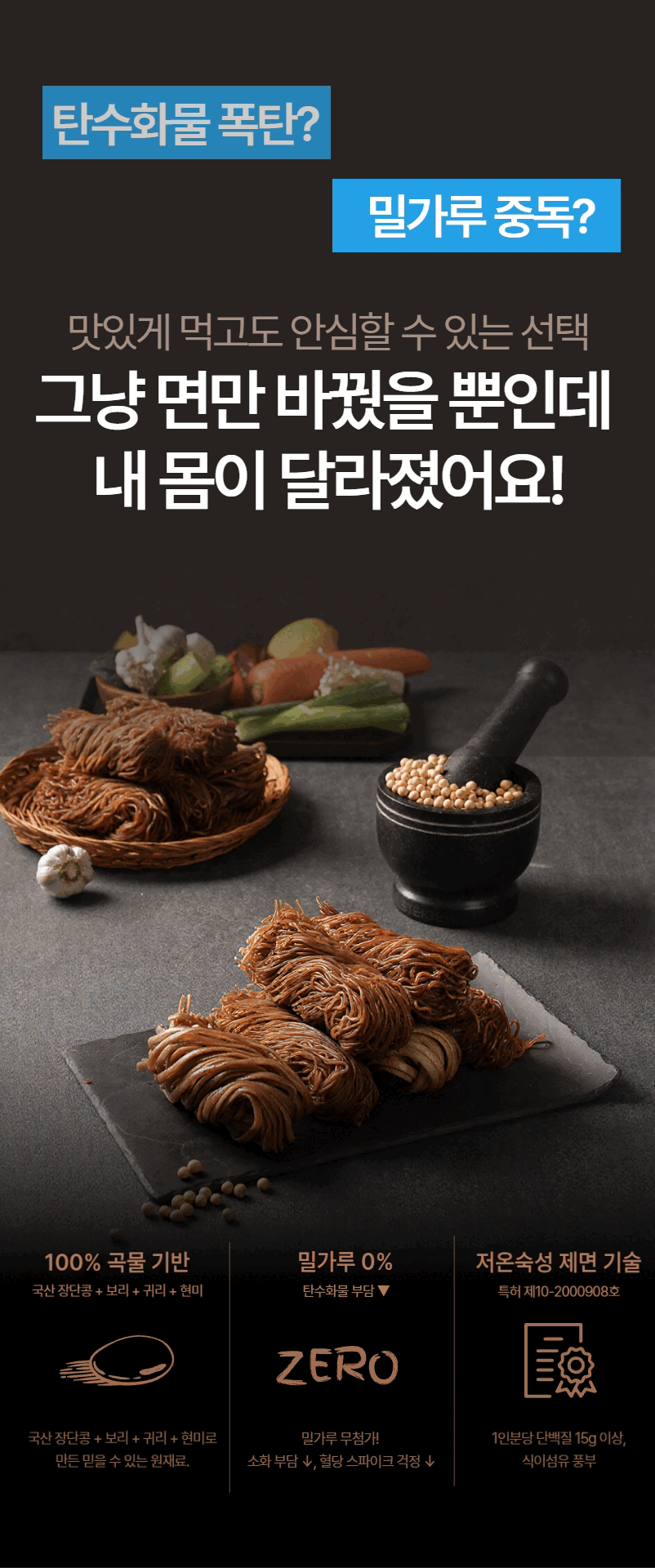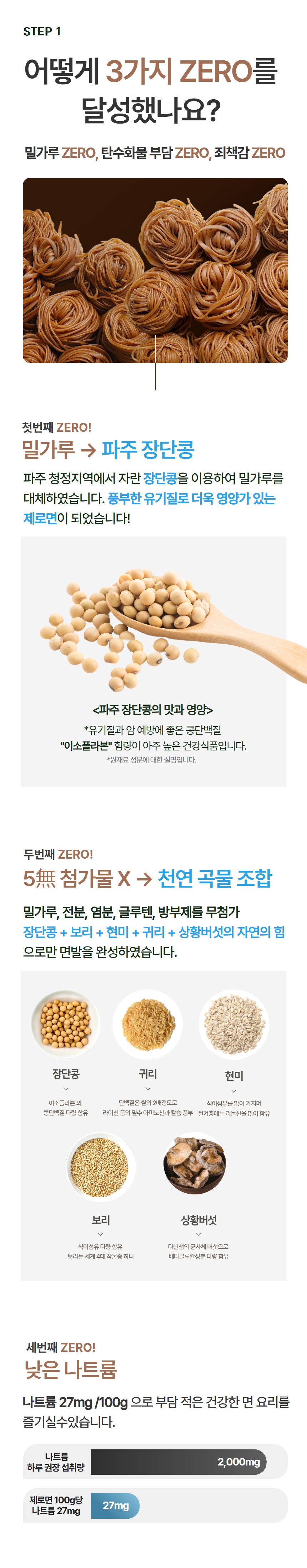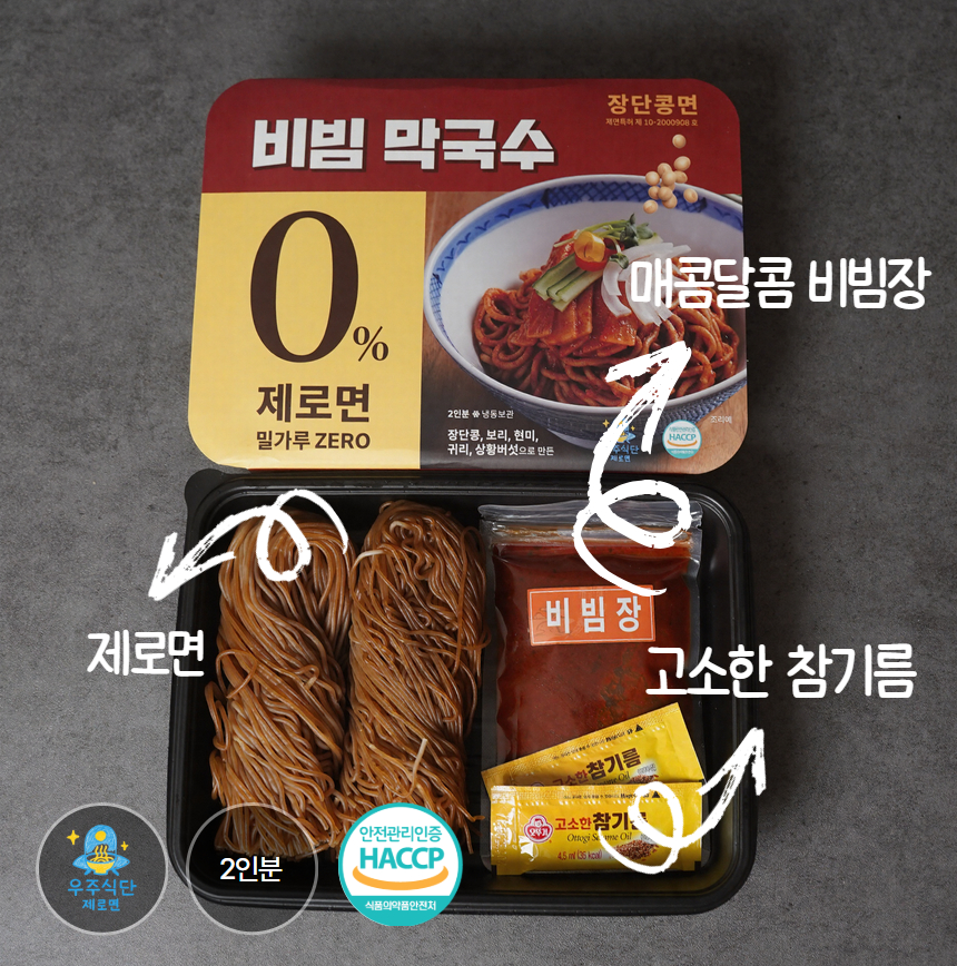 장단콩면(300g) : 장단콩5%(국내산), 보리(국내산), 쌀(외국산), 현미(외국산), 볶은귀리(캐나다산), 상황버섯 비빔소스 (100g: 양파 27g, 설탕, 고추가루(중국산), 고추장{물엿, 소맥분(밀:미국산,호주산), 정제수, 고추양념(중국산/고춧가루,정제소금,마늘,양파), 탈지대두분(중국산),정제소금, 밀쌀, 혼합미분, 주정,L-글루탐산나트륨(향미증진제),종국}, 매실농축액, 마늘(국산), 식초(주정, 맥아액기스), 진간장{산분해간장[탈지대두(외국산:인도, 미국, 중국 등)], 정제수, 양조간장 [탈지대두(인도산), 소맥(밀:미국산), 천일염(호주산), 종국], 천일염(호주산), 물엿, L-글루탐산나트륨(향미증진제), 혼합제제(스테비올배당체, 덱스트린), 효소처리 스테비아, 파라옥시안식향산에틸(보존료), 비타민Bi라우릴황산염(영양강화제)},식초 {정제수, 사과농축액, 주정, 발효영양원, 구연산}, 매실농축액, 마늘(국내산) 참기름(9g) :외국산