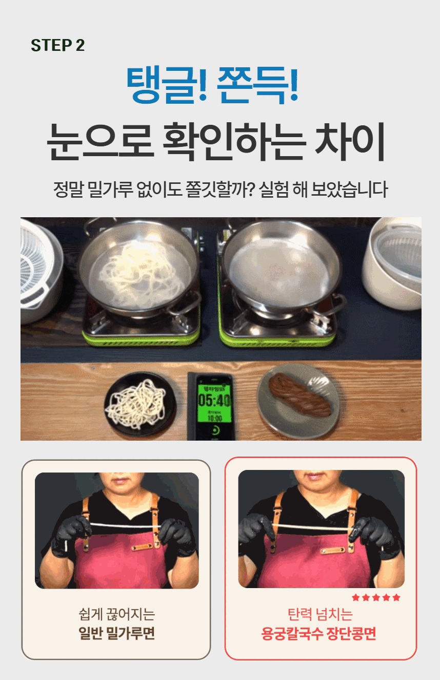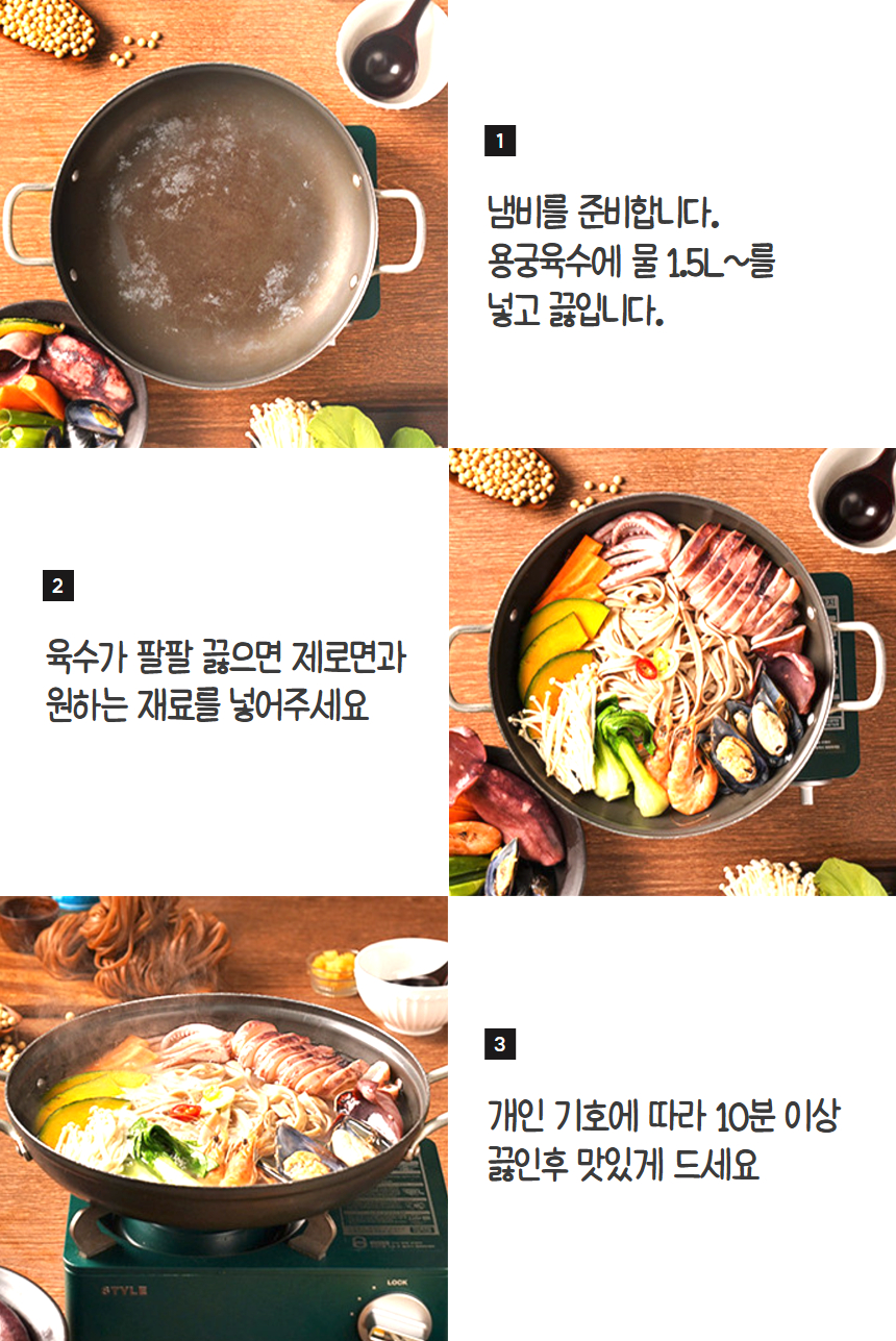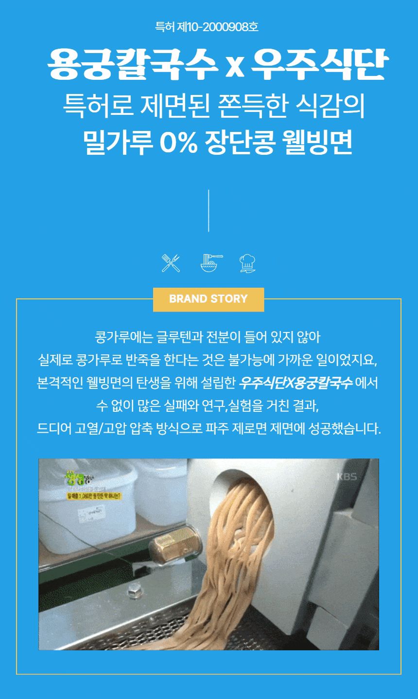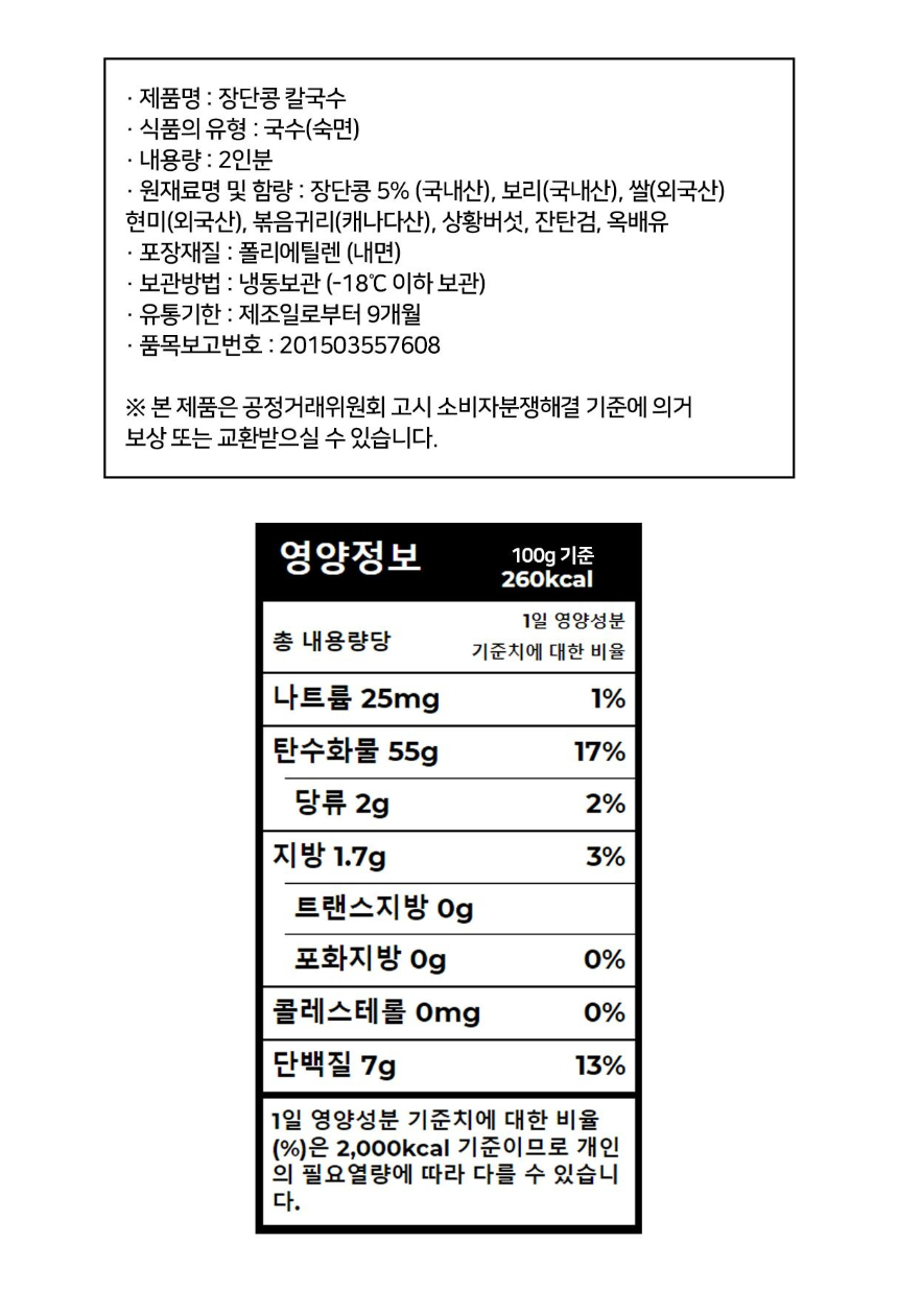 장단콩면(300g) : 장단콩5%(국내산), 보리(국내산), 쌀(외국산), 현미(외국산), 볶은귀리(캐나다산), 상황버섯 용궁육수(50g) : 간장,L-글루탄산나트륨(향미증진제),흑후추분말,구연산,소브산칼륨(보존료),파라옥시안향산에틸(보존료)L-글루탐산나트륨(향미증진제).기타가공품,설탕,다랑어분말], 정제소금,설탕,소스(C),소스(D),소스(E), 양조[정제소금(국산),맛내기양념분말,(중국산),조미멸치분말,포도당,멸치추출농축액],복합조미료식품(B)[정제소금,소스(B)[알본산/환원물엿,가다랑어추출물,혼합가다랑어추출물,건조가다랑어추출물,정제소금],복합조미식품(A)정제수,소스(a)[멸치추출액{멸치추출농축액-K(멸치,국산)},말토덱스트린,정제소금(국산),DL-알라닌,트레하]