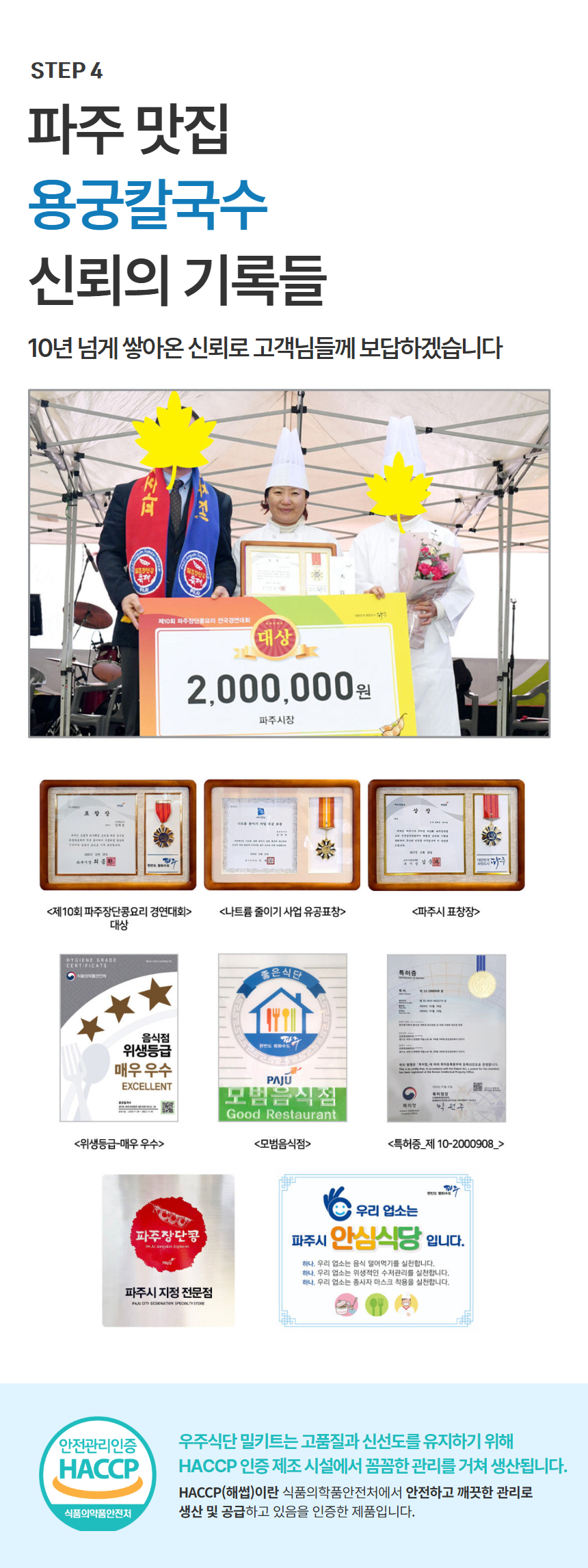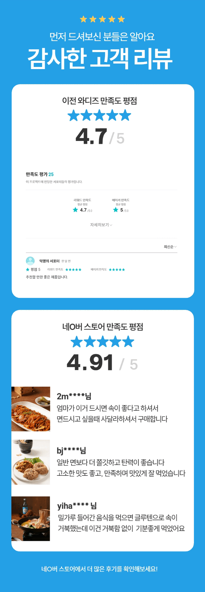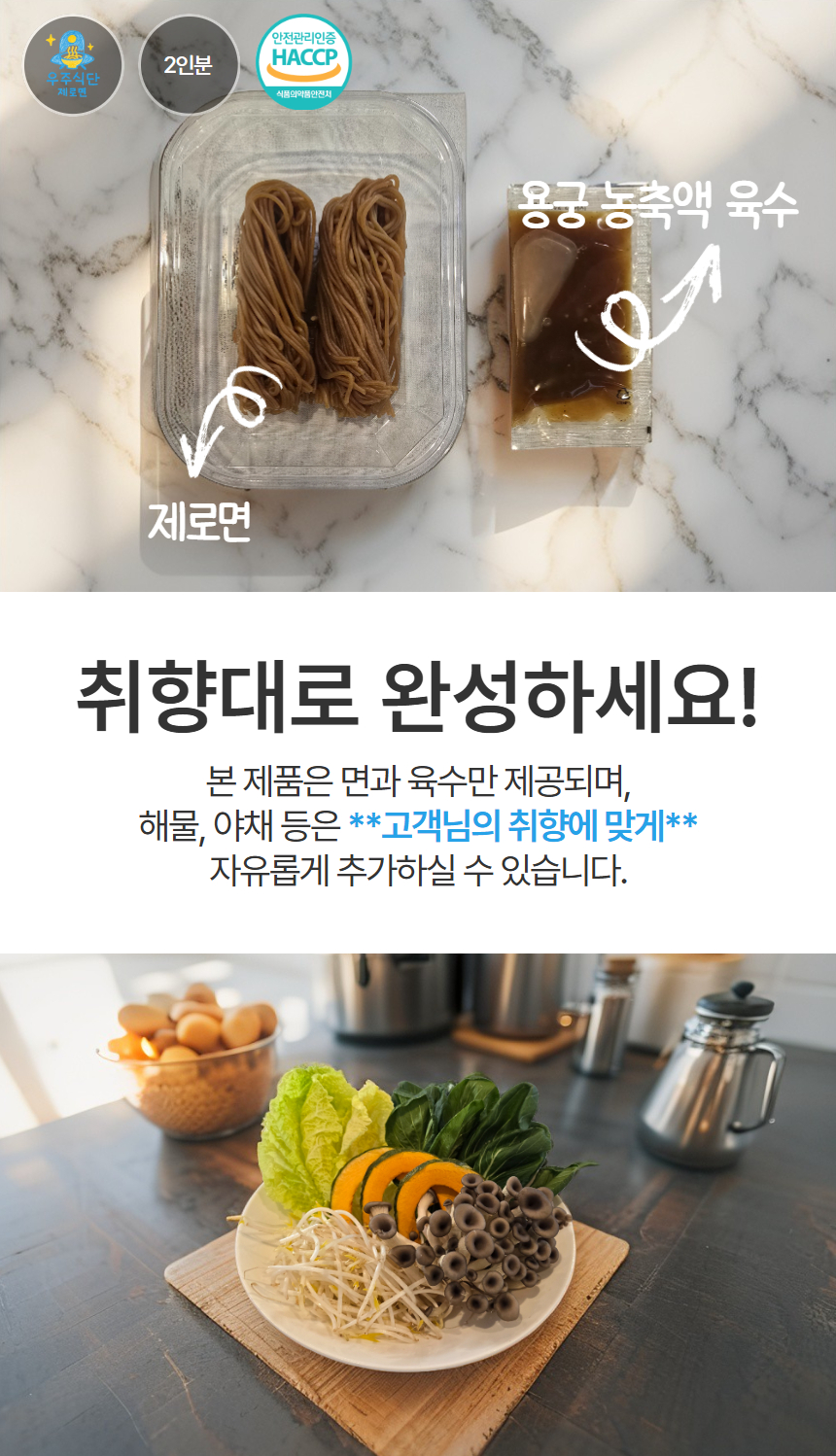 장단콩면(300g) : 장단콩5%(국내산), 보리(국내산), 쌀(외국산), 현미(외국산), 볶은귀리(캐나다산), 상황버섯 용궁육수(50g) : 간장,L-글루탄산나트륨(향미증진제),흑후추분말,구연산,소브산칼륨(보존료),파라옥시안향산에틸(보존료)L-글루탐산나트륨(향미증진제).기타가공품,설탕,다랑어분말], 정제소금,설탕,소스(C),소스(D),소스(E), 양조[정제소금(국산),맛내기양념분말,(중국산),조미멸치분말,포도당,멸치추출농축액],복합조미료식품(B)[정제소금,소스(B)[알본산/환원물엿,가다랑어추출물,혼합가다랑어추출물,건조가다랑어추출물,정제소금],복합조미식품(A)정제수,소스(a)[멸치추출액{멸치추출농축액-K(멸치,국산)},말토덱스트린,정제소금(국산),DL-알라닌,트레하]