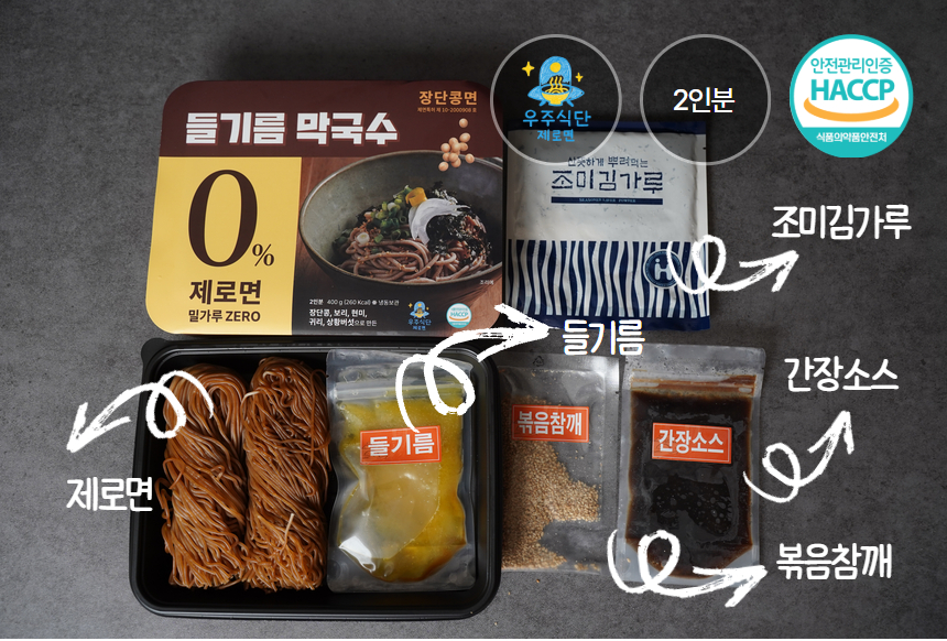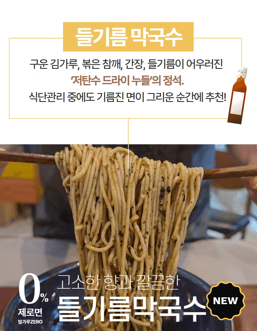 ① 들기름 막국수 (장단콩면 300g, 생들막소스 80g, 들기름 60g,김가루 4g, 볶은참깨 10g, 총 454g)