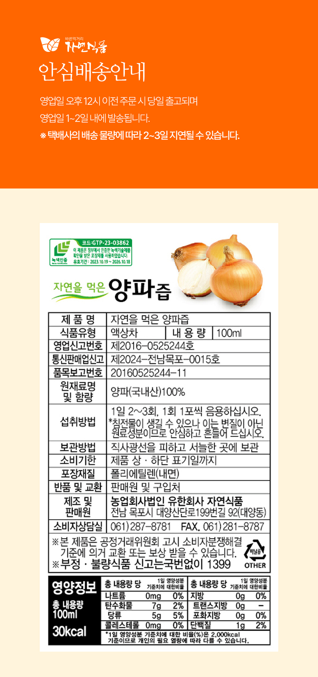 • 자연을 먹은 무안 양파즙 100ml x 100팩 / HACCP