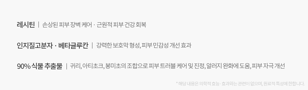 정제수, 글리세린, 카프릴릭/카프릭트라이글리세라이드, 솔비탄스테아레이트, 1,2 산다이올, 세테아릴알코올, 글리세릴스테아레이트, 사이클로사실록세인, 다시마추출물, 한련초잎추출물, 병풀추출물, 무화과추출물, 귀리커넬추출물, 아티초크잎추출물,병풀뿌리추출물, 병풀잎추출물, 하이드로제네이티드레시틴, 녹차수, 팔미틱애씨드, 알파 비사보롤,스테아릭애씨드,카보머,트로메타민,잔탄검, 프토올리고사카라이드, 트라이소듐이디티에이, 베타 글루칸, 부틸렌글라이콜, 판테놀, 미리스틱애씨드, 하이드롤라이즈드하이알루로닉애씨드, 메틸프로판다이올, 라피노오스, 폴릭애씨드, 세라마이드엔피, 콜레스테롤, 폴리터늄-51,효모발효물, 아시아티코사이드, 마데카소사이드, 팔미토일펜타펩타이드 4, 마데카식애씨드, 아시아틱애씨드, 하이드록시아세토페논, 에틸헥실글리세린