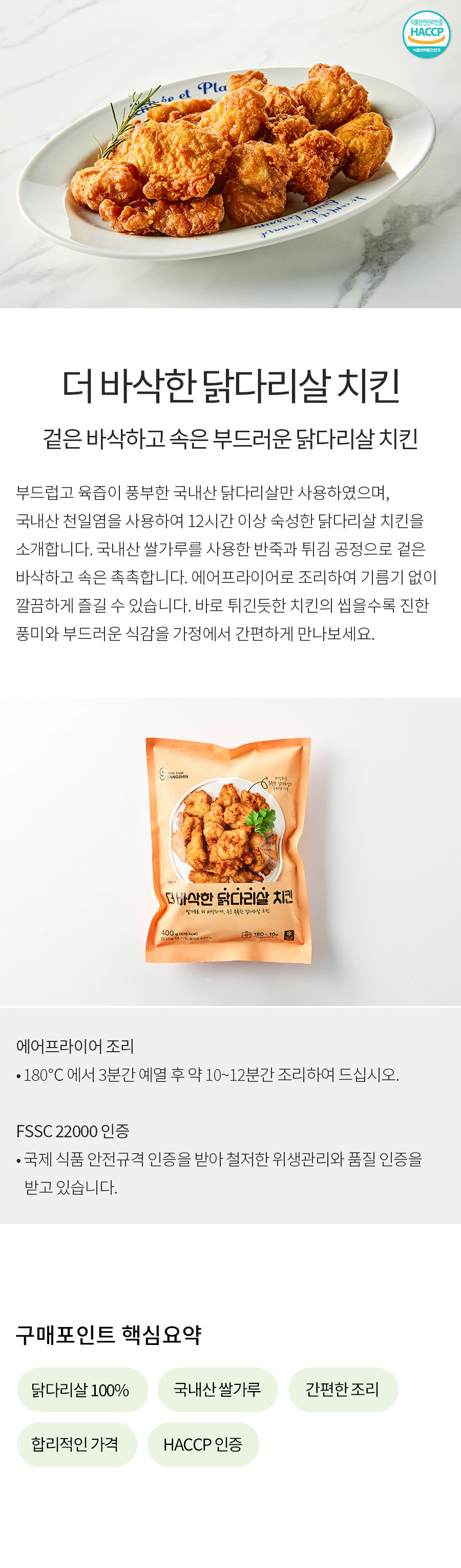 수량 선택 400g X 1개 10,500원 400g X 2개 20,500원 400g X 3개 30,000원 더 바삭한 닭다리살 치킨 수량빼기 수량추가 개 0 원 총 수량 0 개 0 원 구매옵션 닫기 찜하기 추가 찜하기 삭제 구매후기 10 상품상세 정기구독 장바구니 정기구독 장바구니 구매하기 정기배송으로 구매하기