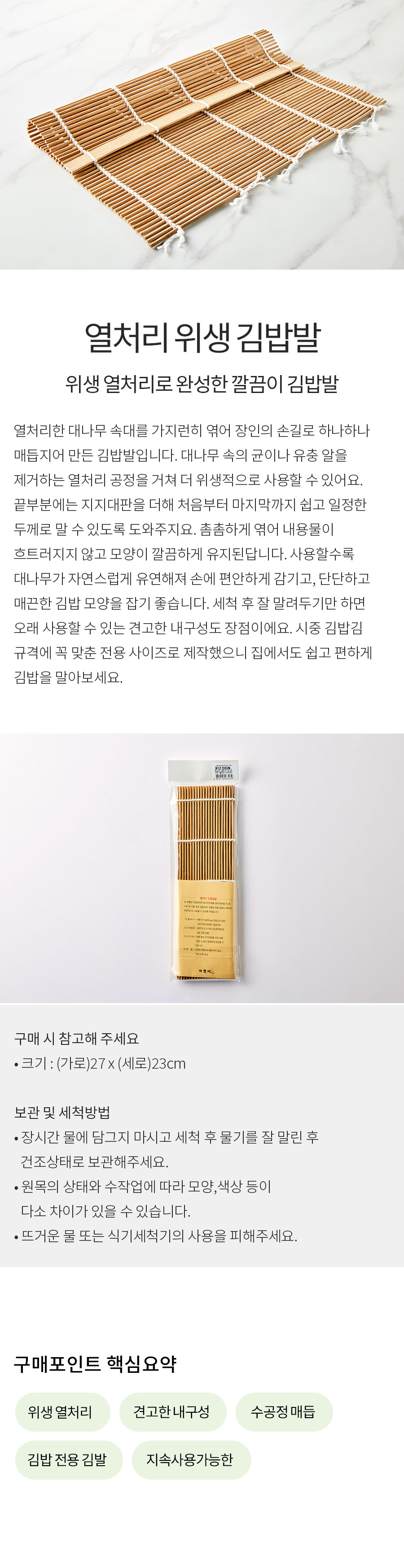 열처리 위생 김밥발 (27x23cm) 수량빼기 수량추가 3,000 원 총 수량 1 개 3,000 원 구매옵션 닫기 찜하기 추가 찜하기 삭제 구매후기 5 상품상세 정기구독 장바구니 정기구독 장바구니 구매하기 정기배송 장바구니