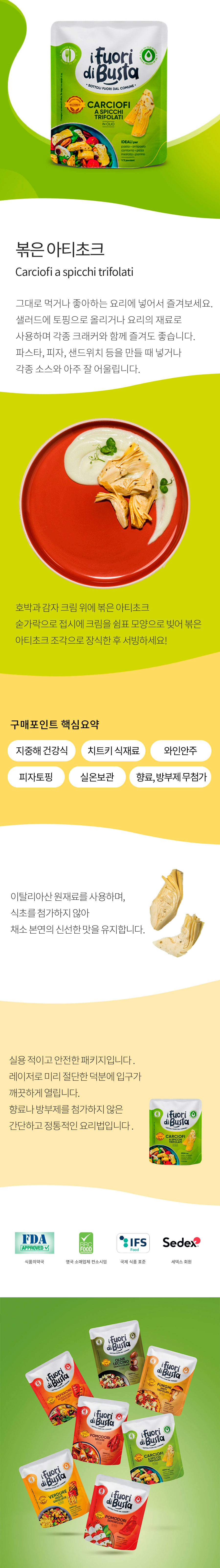 아티초크 92%, 해바라기오일 5%, 식염, 설탕, 건조마늘 0.11%, 건파슬리 0.02%, 건조양파 0.09%, 비타민C, 구연산