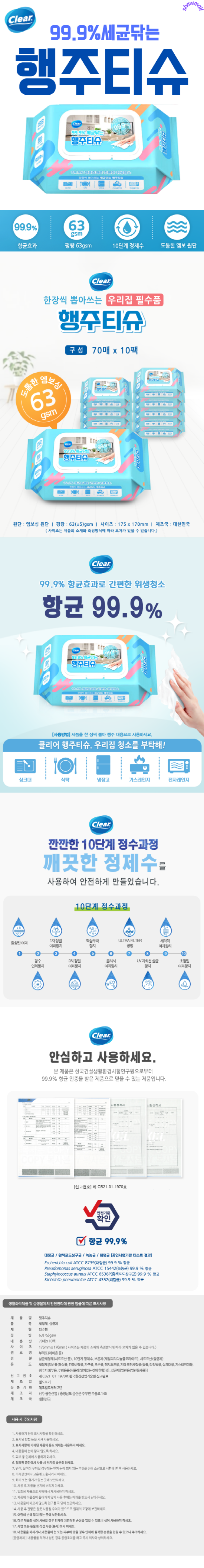 클리어 세균닦는 행주티슈 70매 x 10팩/20팩 아기물티슈 유아물티슈