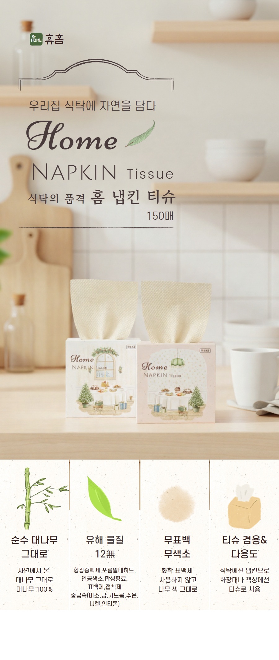 휴홈 무표백 대나무 홈냅킨 티슈 150매 12개